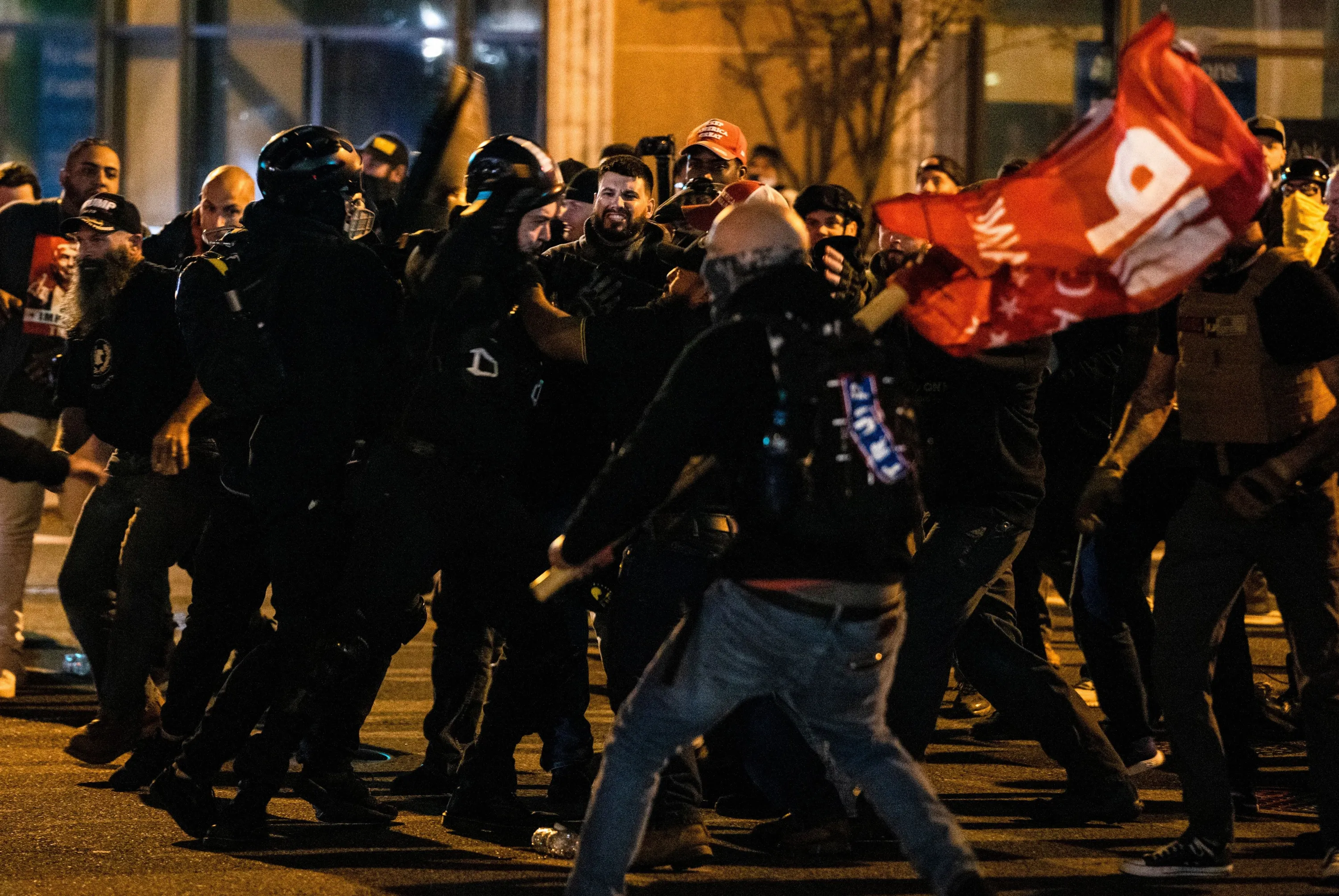 Members of Antifa and Proud Boys clash in the middle of the street following the “Million MAGA March” on November 14, 2020 in Washington, DC. Various pro-Trump groups gathered in DC today for the “Million MAGA March” to protest the results of the 2020 presidential election. (Photo by Samuel Corum/Getty Images)