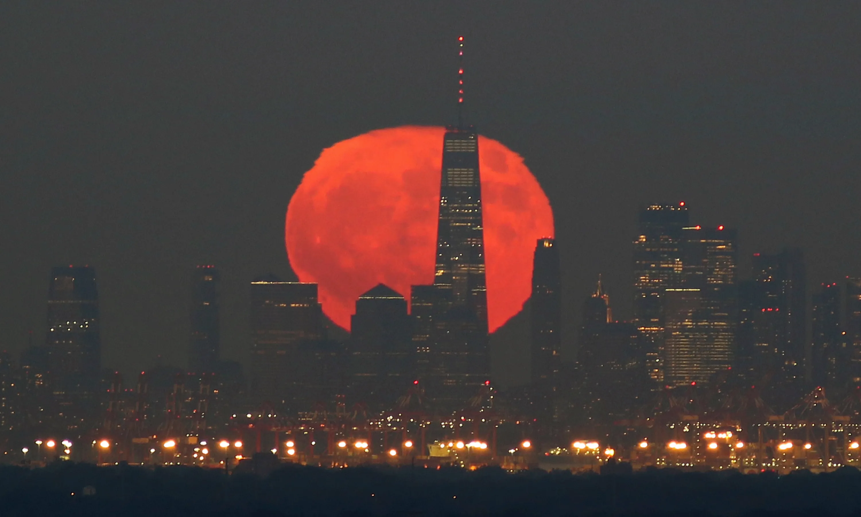 The full Blue Moon and Hunter's Moon rises behind lower Manhattan and One World Trade Center in New York City on Halloween on October 31, 2020 as seen from Greenbrook Township, New Jersey. (Photo by Gary Hershorn/Getty Images)