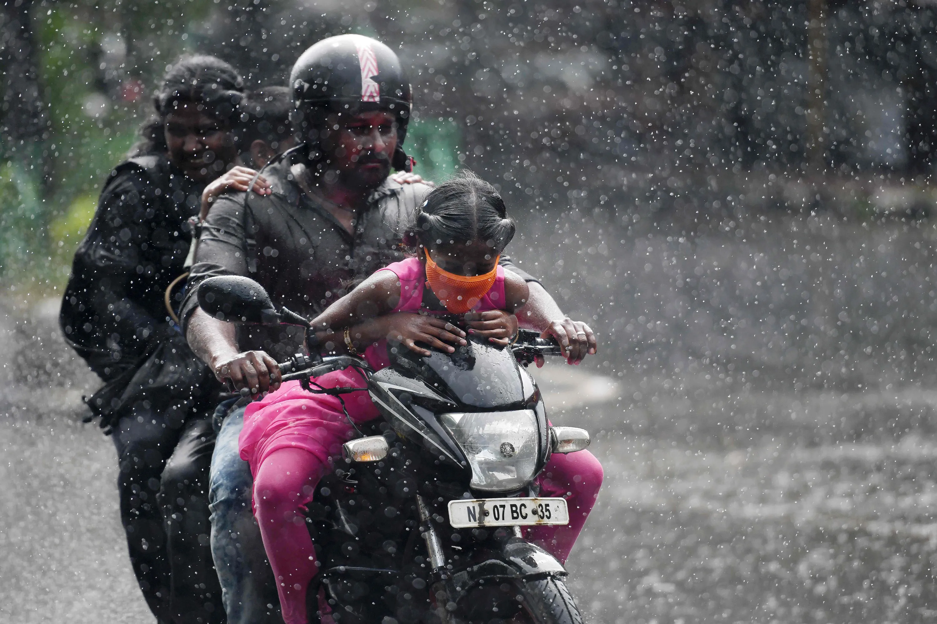 A family rides on a motorbike during a heavy rain shower in Chennai on November 18, 2020. (Photo by Arun Sankar/AFP Photo)