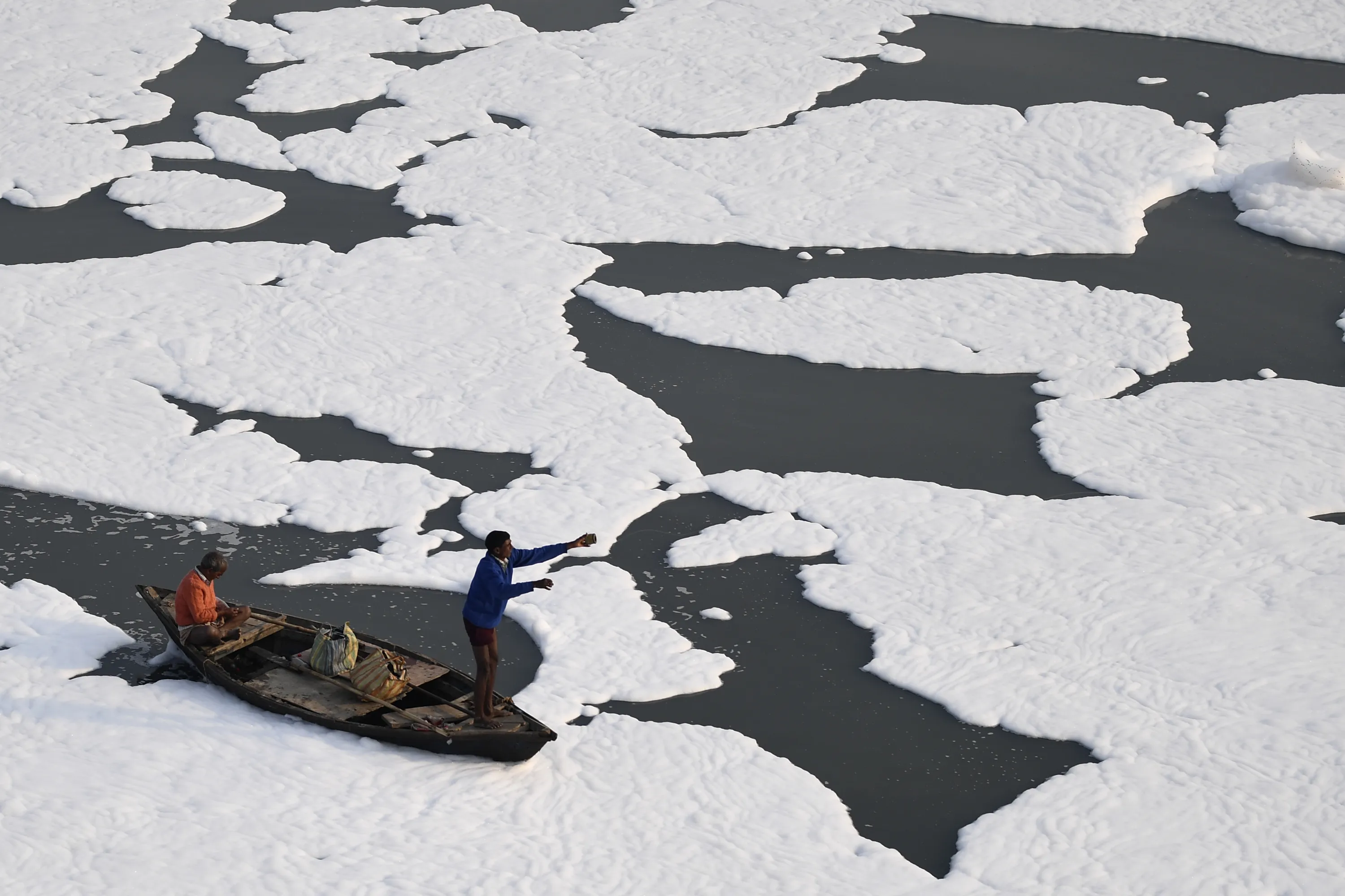 Men row a boat in the polluted waters of river Yamuna covered with foam in New Delhi on November 19, 2020. (Photo by Sajjad Hussain/AFP Photo)