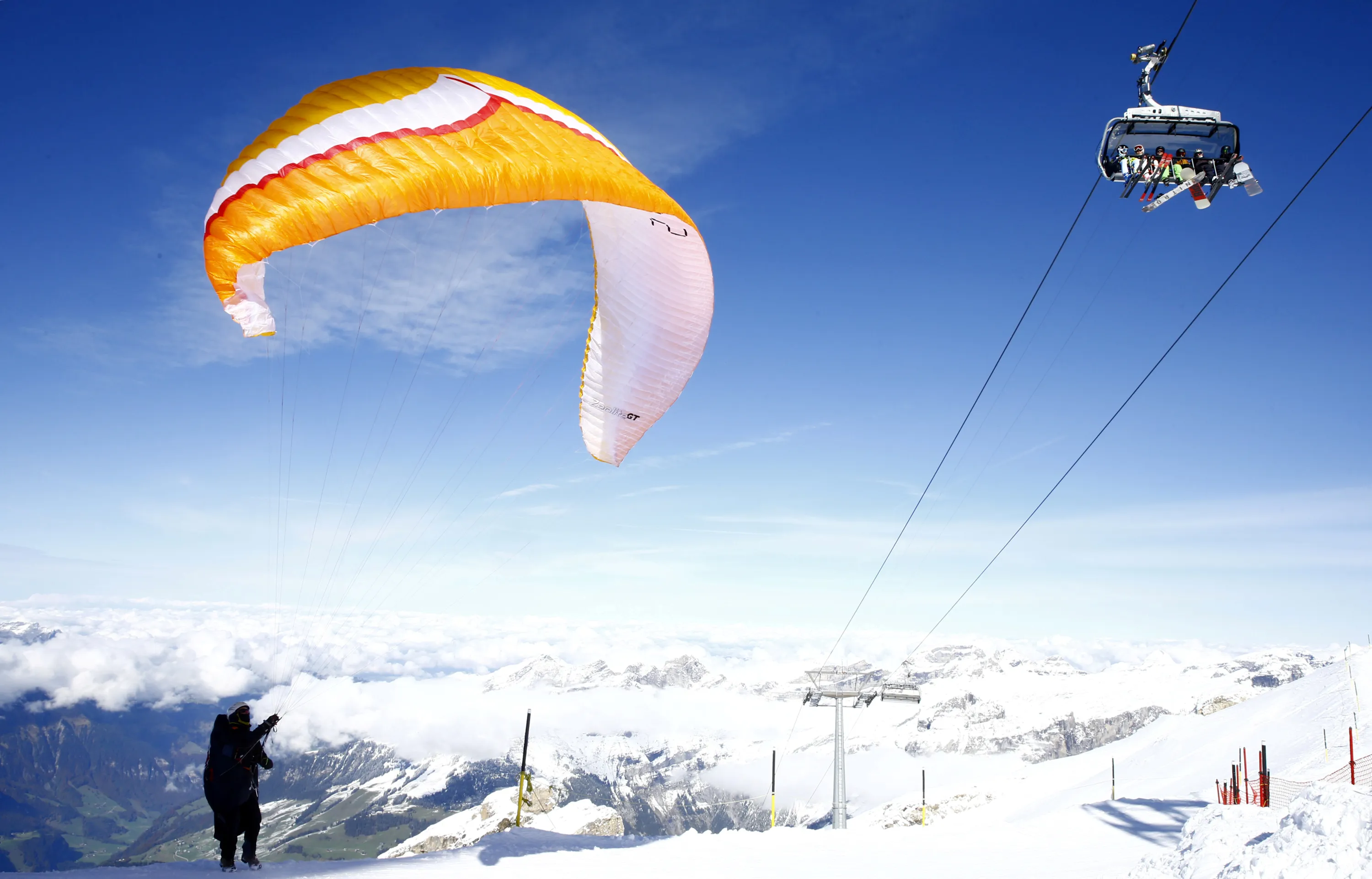 A paraglider prepares to start as skiers sit in a chair lift during sunny autumn weather at the Mount Titlis skiing area near the Alpine resort of Engelberg, Switzerland on October 13, 2020. (Photo by Arnd Wiegmann/Reuters)
