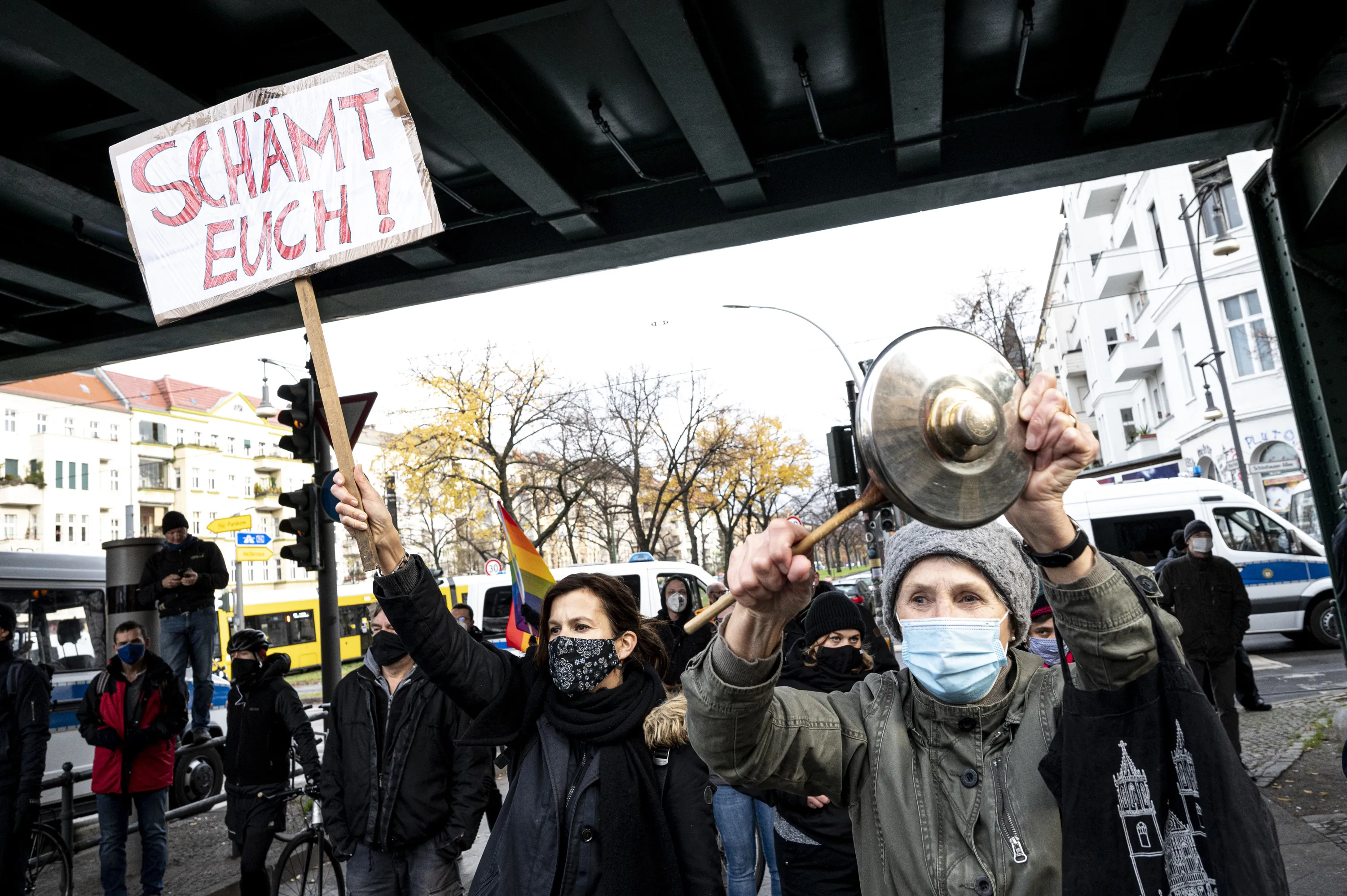 Counter demonstrators shows a poster reading: “shame on you” as the protest against a so called “silent march” against the corona policy of the federal government, at the district Prenzlauer Berg in Berlin Germany, Sunday, November 22, 2020. (Photo by Fabian Sommer/dpa via AP Photo)