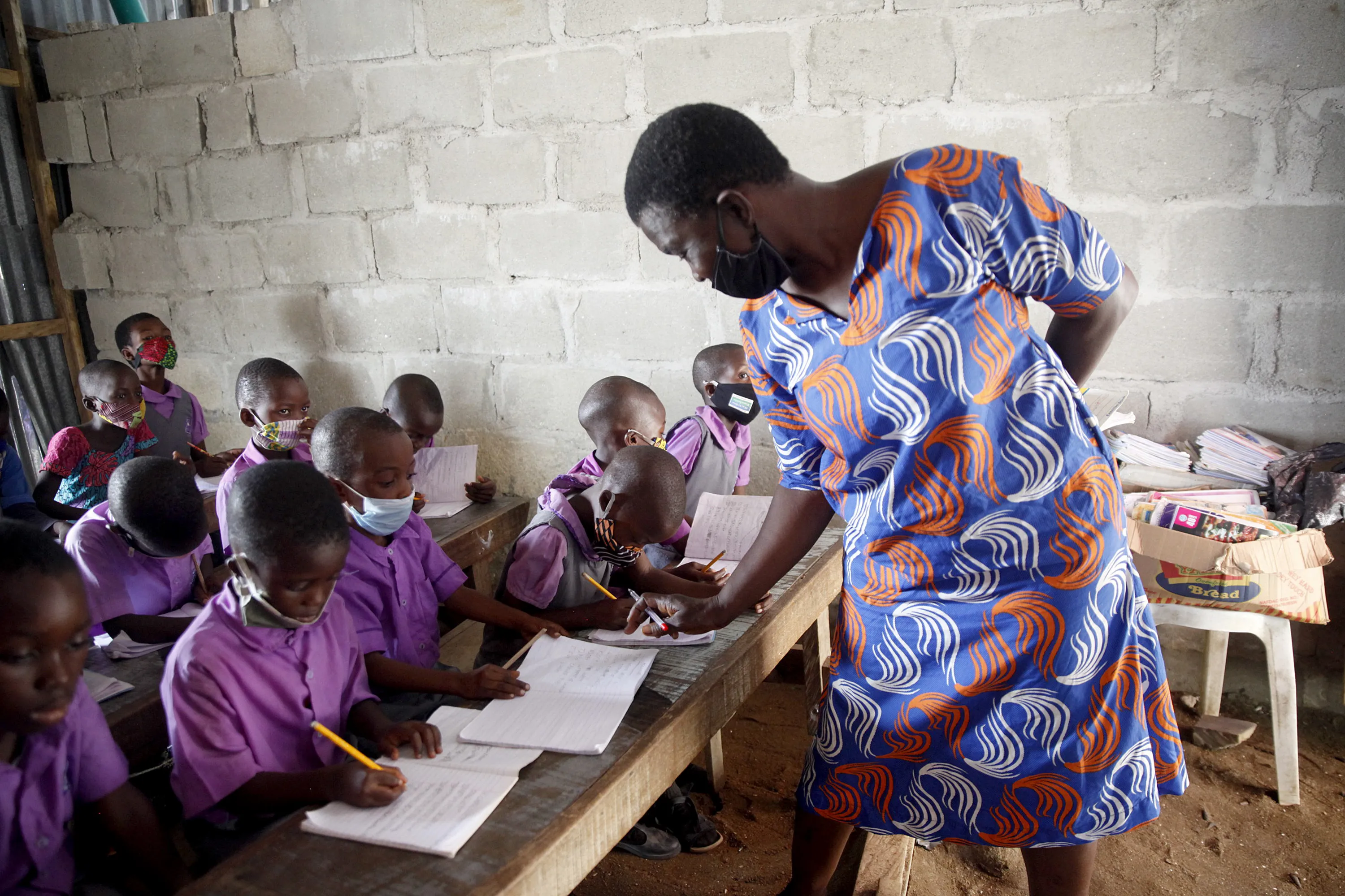 A teacher conducts a class at the Bright Achievers tuition-free school in the Bariga slum settlement, in Lagos, Nigeria, 13 November 2020. Bright Achievers, founded in 2017, is a tuition-free school in the Bariga district, a slum settlement with many underprivileged children whose parents mostly cannot afford sending their children to private and public schools. Most public schools in the Bariga district are congested and like in most slum settlements in Nigeria, are often in a state of disrepair. Seun Awobajo, founder of the school, who is also a drama director, says the school runs on voluntary donations from friends and on his personal finances, as he adopted twenty-seven of the students as either orphans or homeless children. (Photo by Akintunde Akinleye/EPA/EFE/Rex Features/Shutterstock)