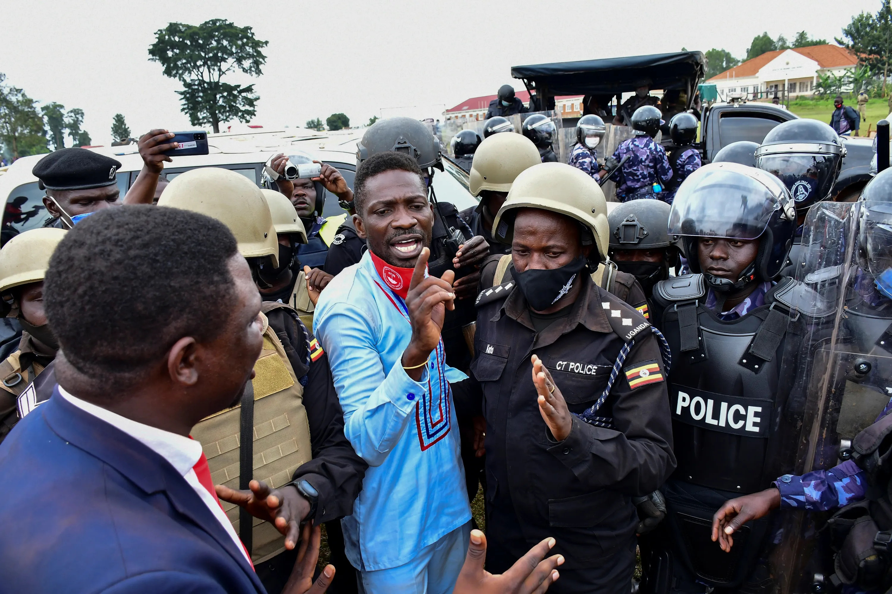 Ugandan presidential candidate Robert Kyagulanyi also known as Bobi Wine is led into a vehicle by riot policemen in Luuka district, eastern Uganda on November 18, 2020. (Photo by Abubaker Lubowa/Reuters)