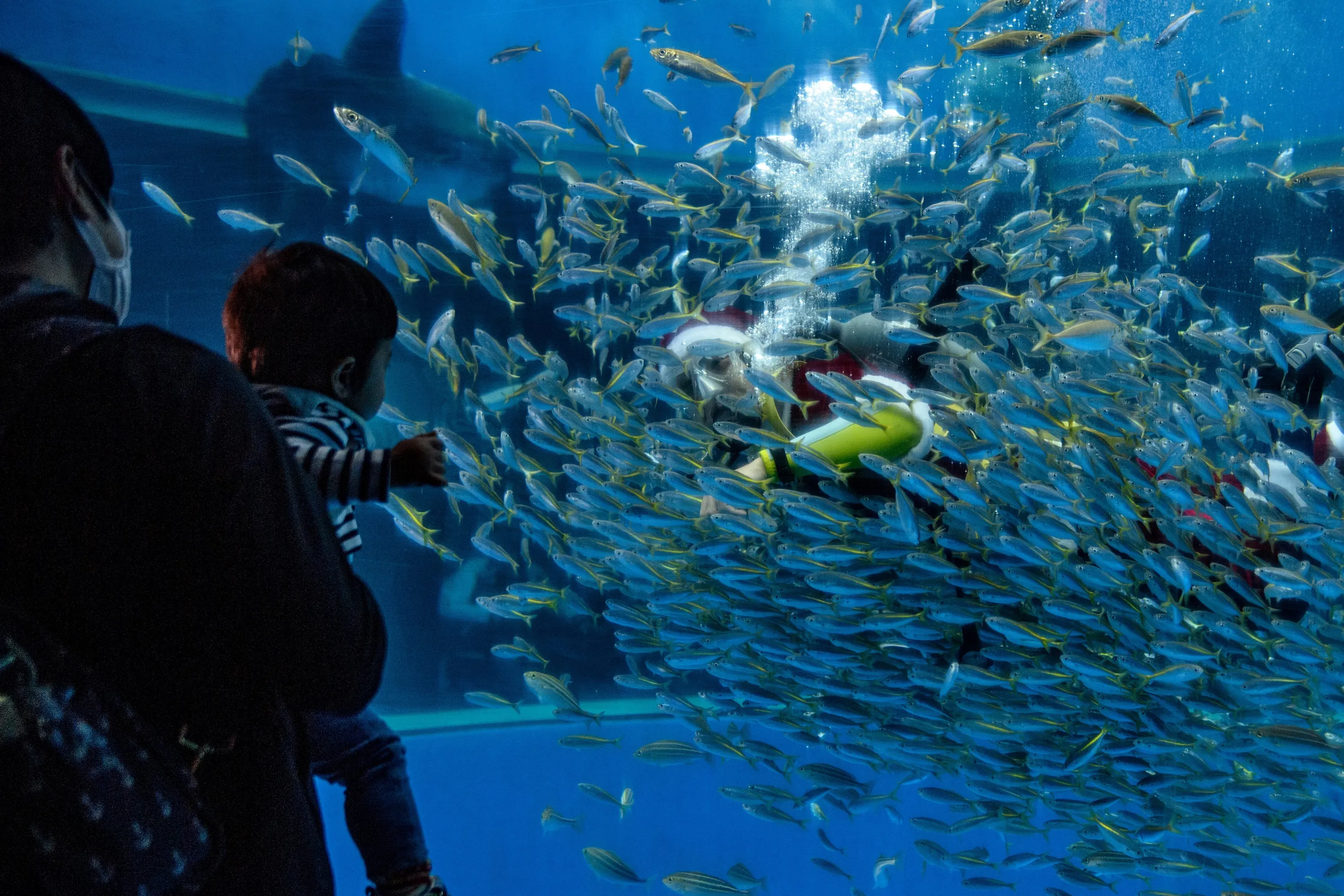 People watch a diver dressed as a Santa Claus feeds fish in an aquarium at the Hakkeijima Sea paradise in Yokohama on November 22, 2020. (Photo by Philip Fong/AFP Photo)