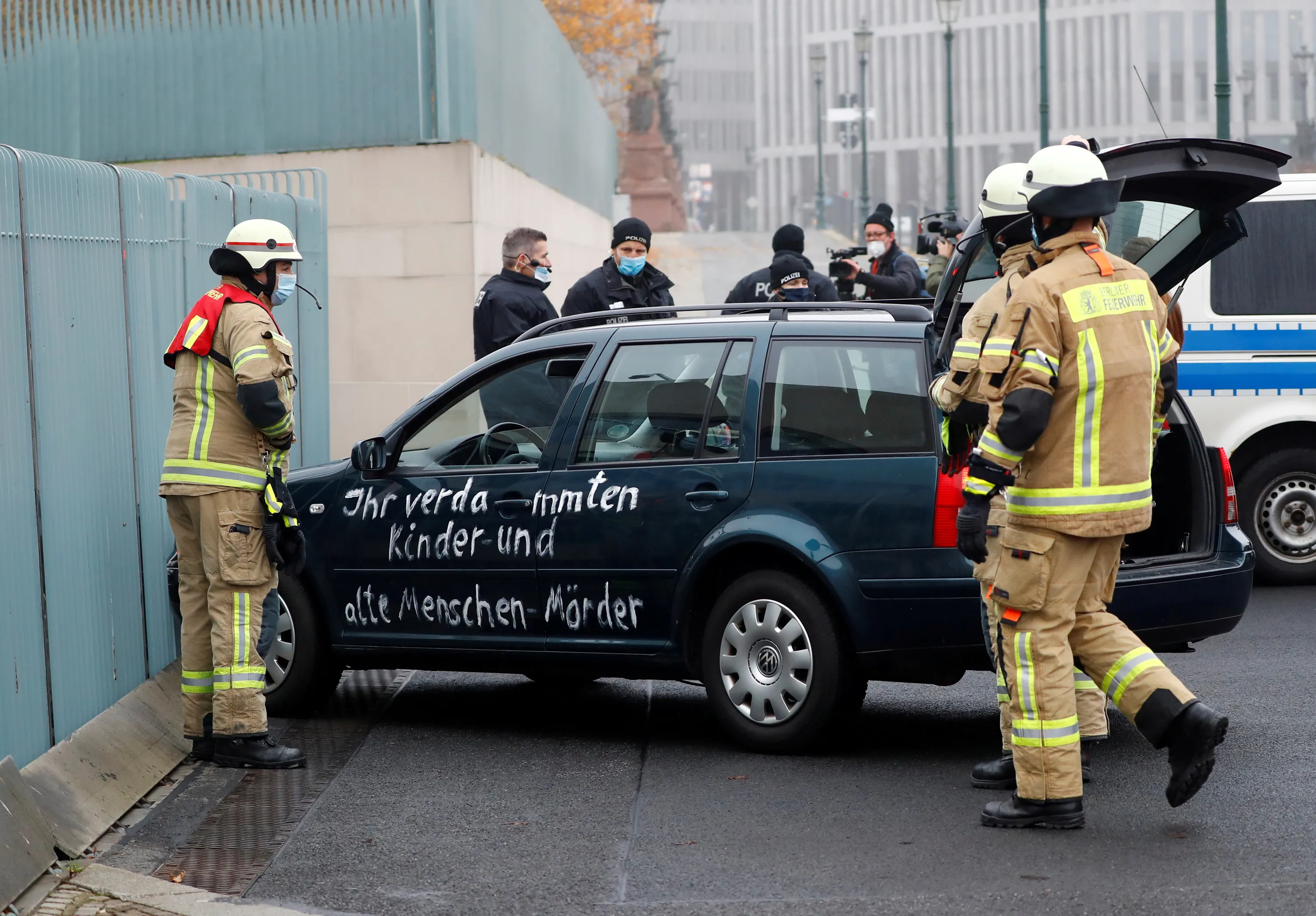 Firefighters remove the car which crashed into the gate of the main entrance of the chancellery in Berlin, the office of German Chancellor Angela Merkel in Berlin, Germany, November 25, 2020. According to a statement, the police are currently clarifying whether the driver hit the gate on purpose. He was taken into police custody. Letters written on the car read: “You damn killers of children and old people”. (Photo by Fabrizio Bensch/Reuters)