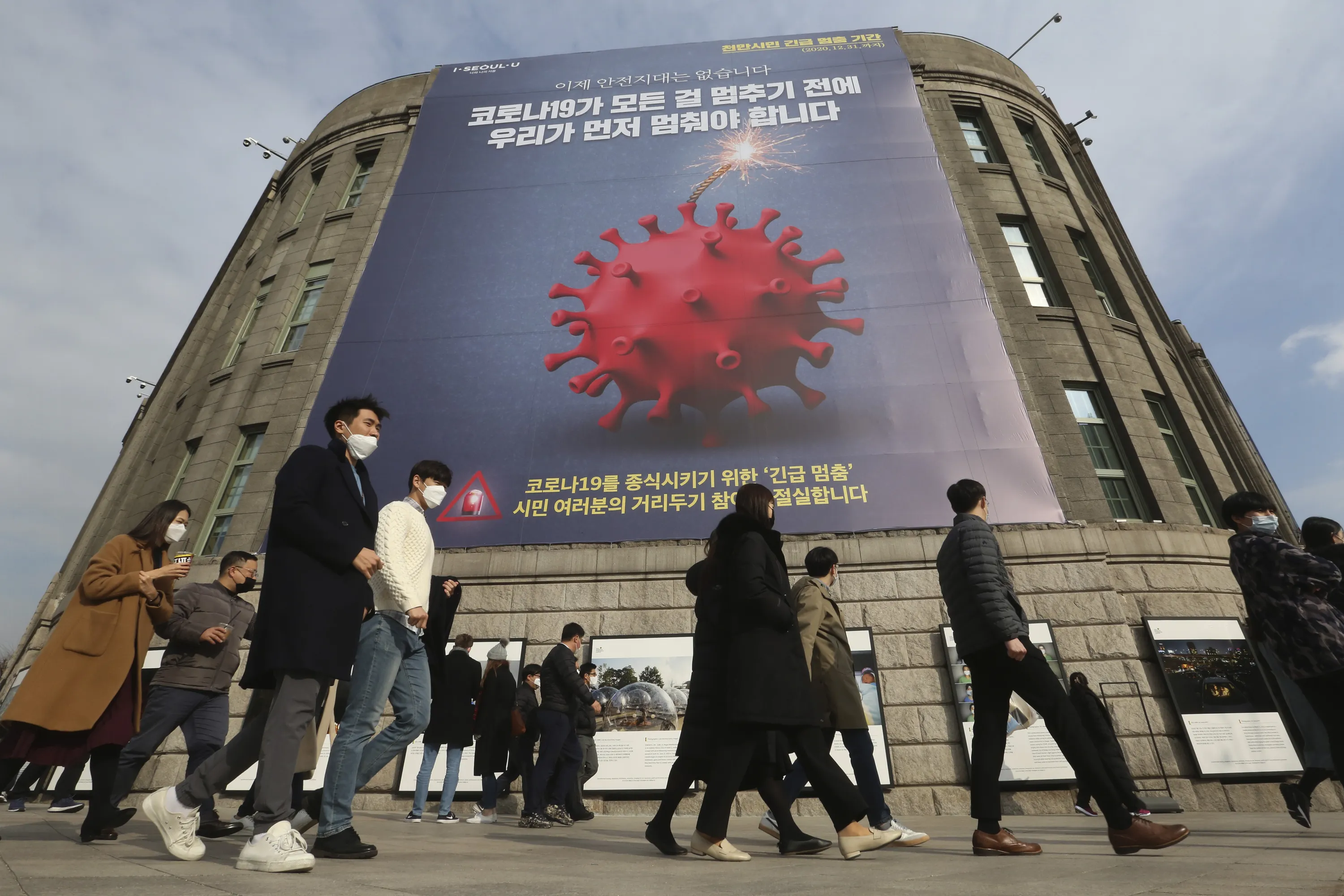 People wearing face masks as a precaution against the coronavirus walk under a banner emphasizing an enhanced social distancing campaign in front of Seoul City Hall in Seoul, South Korea, Wednesday, November 25, 2020. The banner reads: “We have to stop before COVID-19 stops everything”. (Photo by Ahn Young-joon/AP Photo)