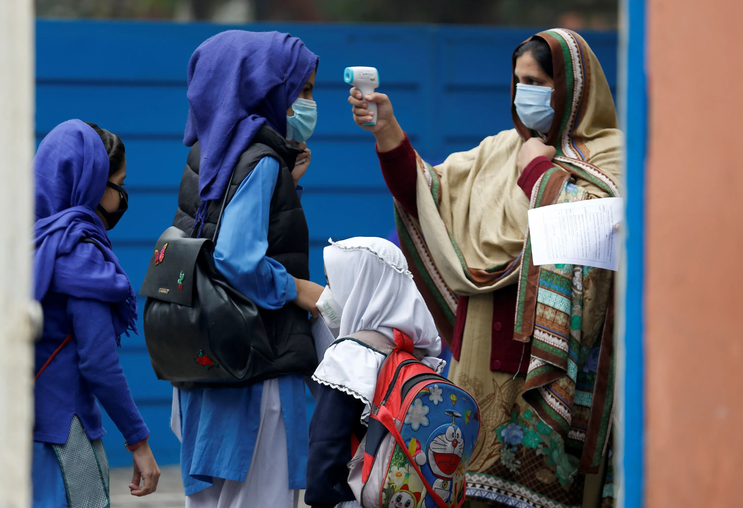 A teacher checks body temperatures of students as they arrive at a school in Lahore, Pakistan, Wednesday, November 25, 2020. Pakistan will again close all educational institutions as of Thursday Nov. 26, 2020, because of a steady and increasingly drastic increase in coronavirus cases. (Photo by K.M.Chaudary/AP Photo)