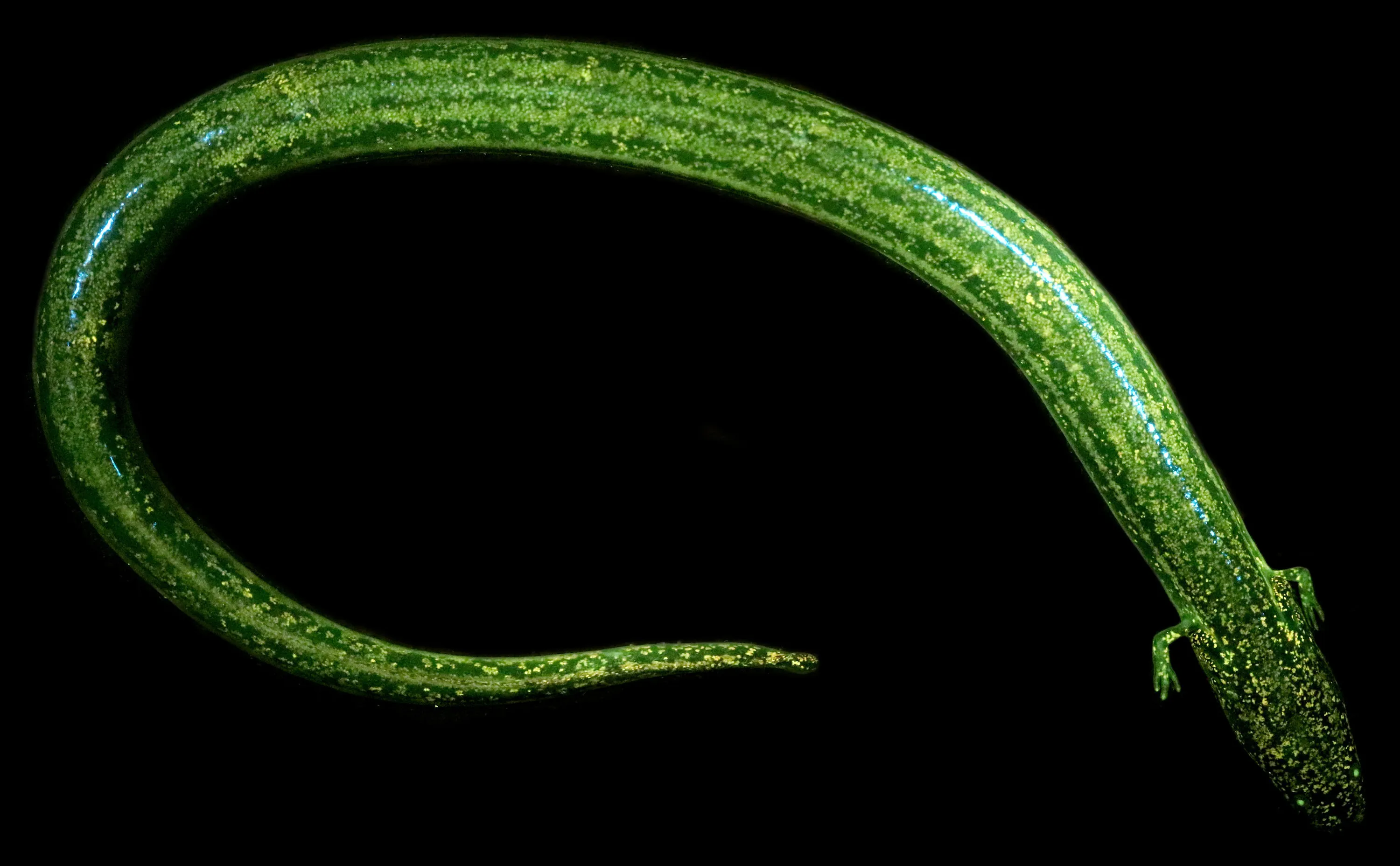 A dwarf siren salamander aglow with bioflourescence. Research suggests the ability to emit the flourescent glow after absorbing light energy may be widespread in amphibians including salamanders and frogs. (Photo by Jennifer Y. Lamb/Matthew P. Davis/PA Wire Press Association)