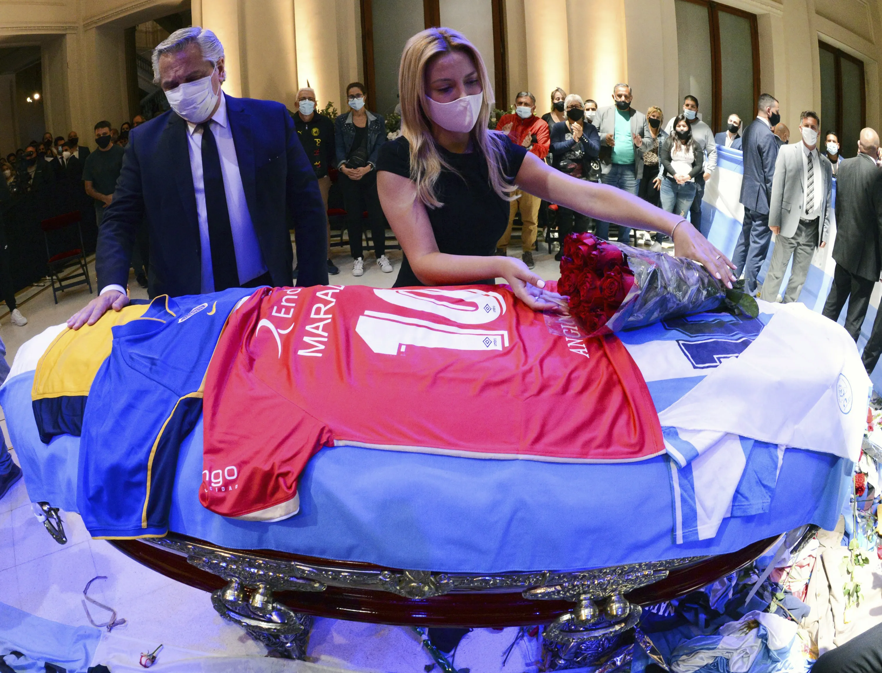 In this handout photo released by Argentina's Presidency, President Alberto Fernandez touches the coffin that contain the remains of Diego Maradona, while first lady Fabiola Yañez places a bouquet of roses on the casket adorned with his team jerseys, as they pay their final respects to Maradona, inside the presidential palace in Buenos Aires, Argentina, Thursday, November 26, 2020. (Photo by Argentina's Presidency via AP Photo)