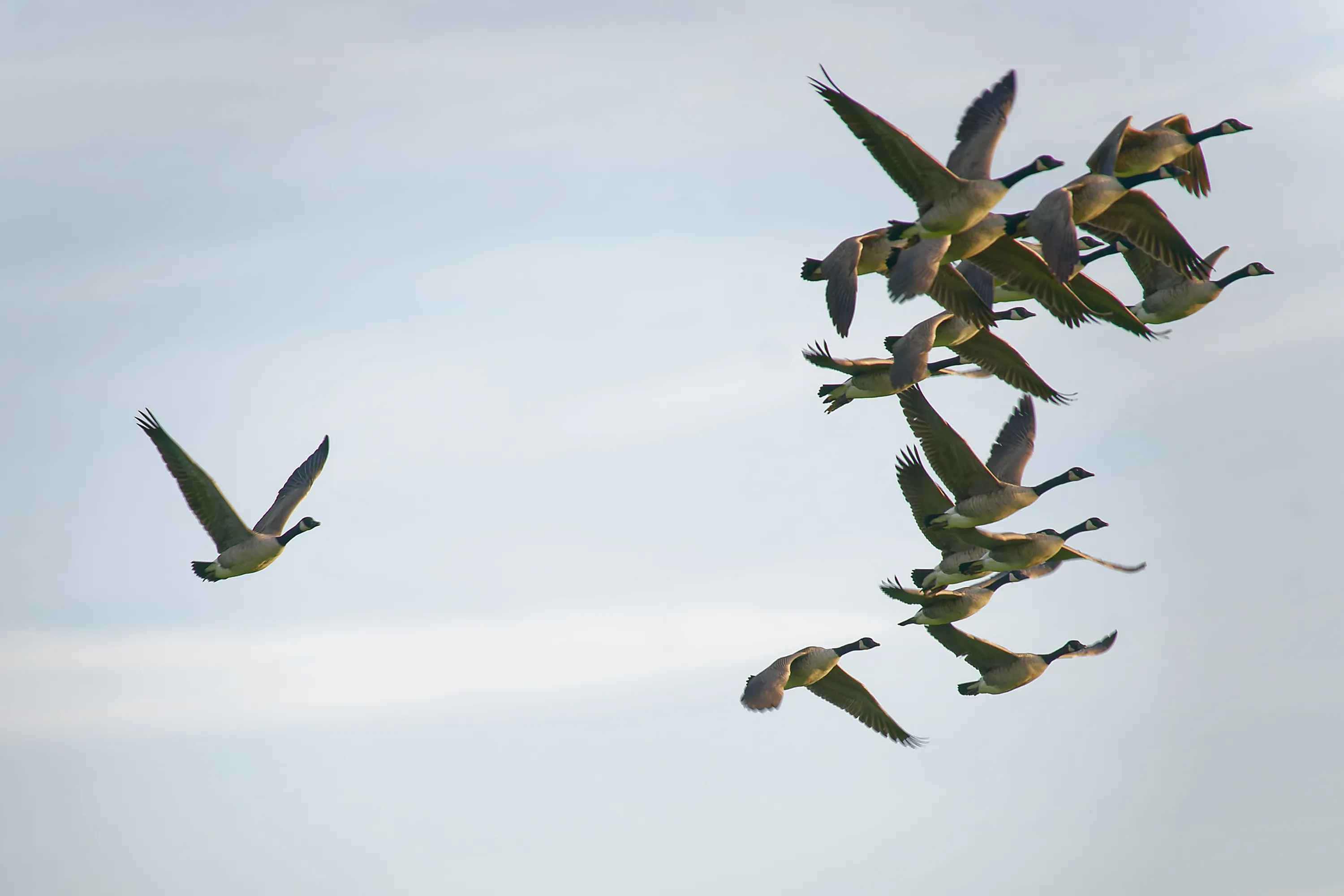 Wild geese fly over fields in North Rhine-Westphalia on the outskirts of Cologne, Germany on November 25, 2020. (Photo by Henning Kaiser/dpa)