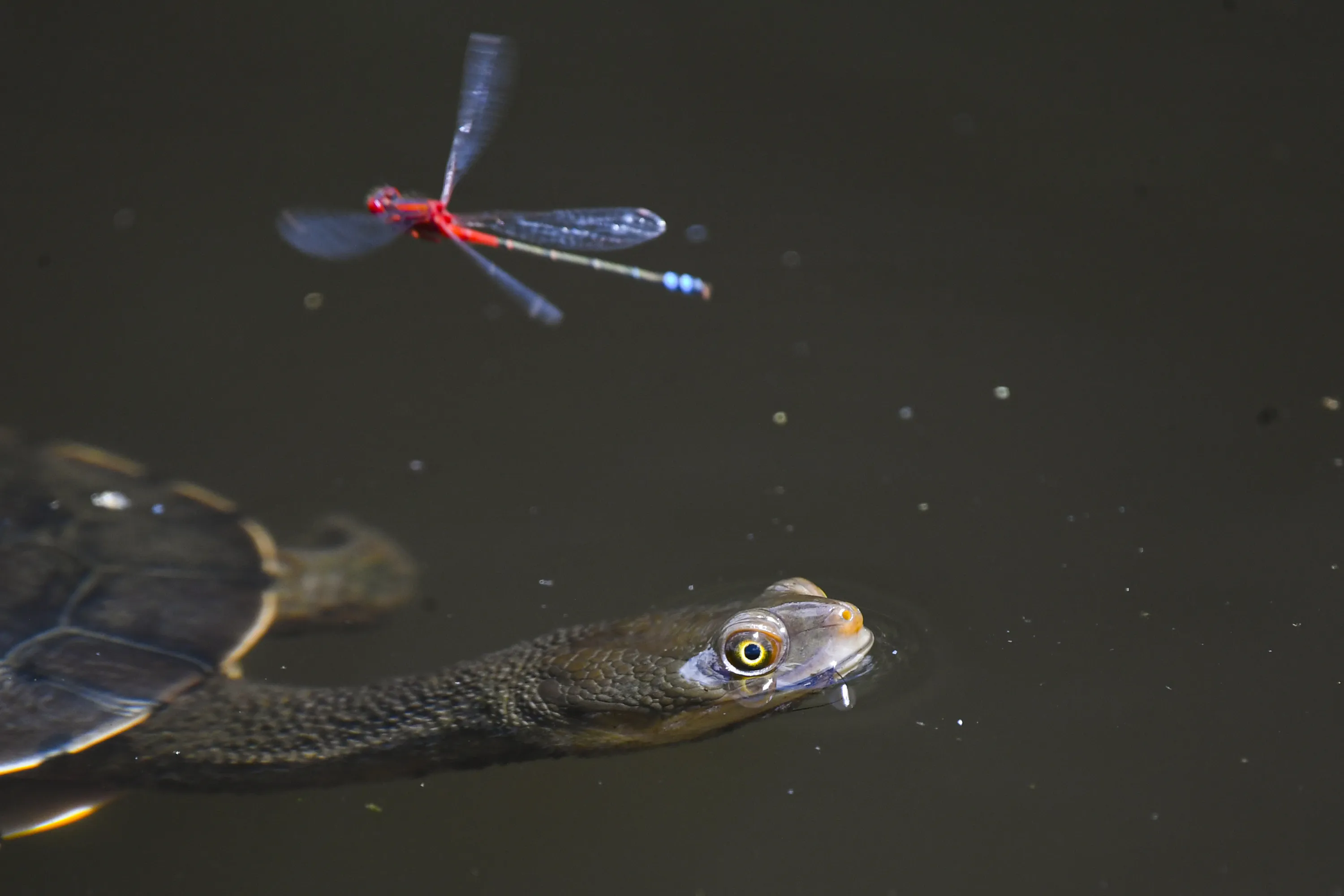 A firefly flies past an Eastern Long-neck turtle at the Tidbinbilla Nature Reserve near Canberra, Tuesday, November 24, 2020. (Photo by Lukas Coch/AAP Image)