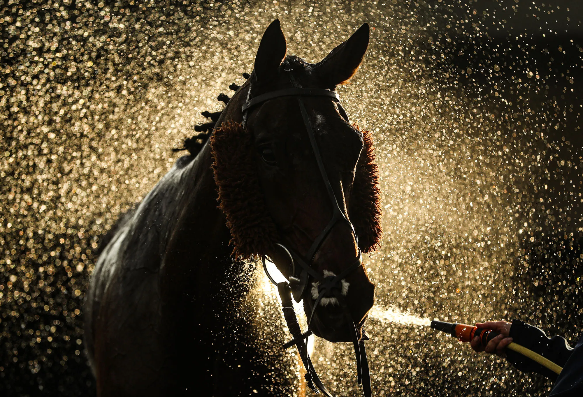 A horse is sprayed down at Warwick Racecourse on November 6, 2020 in Warwick, England. (Photo by David Davies/Pool via Getty Images)