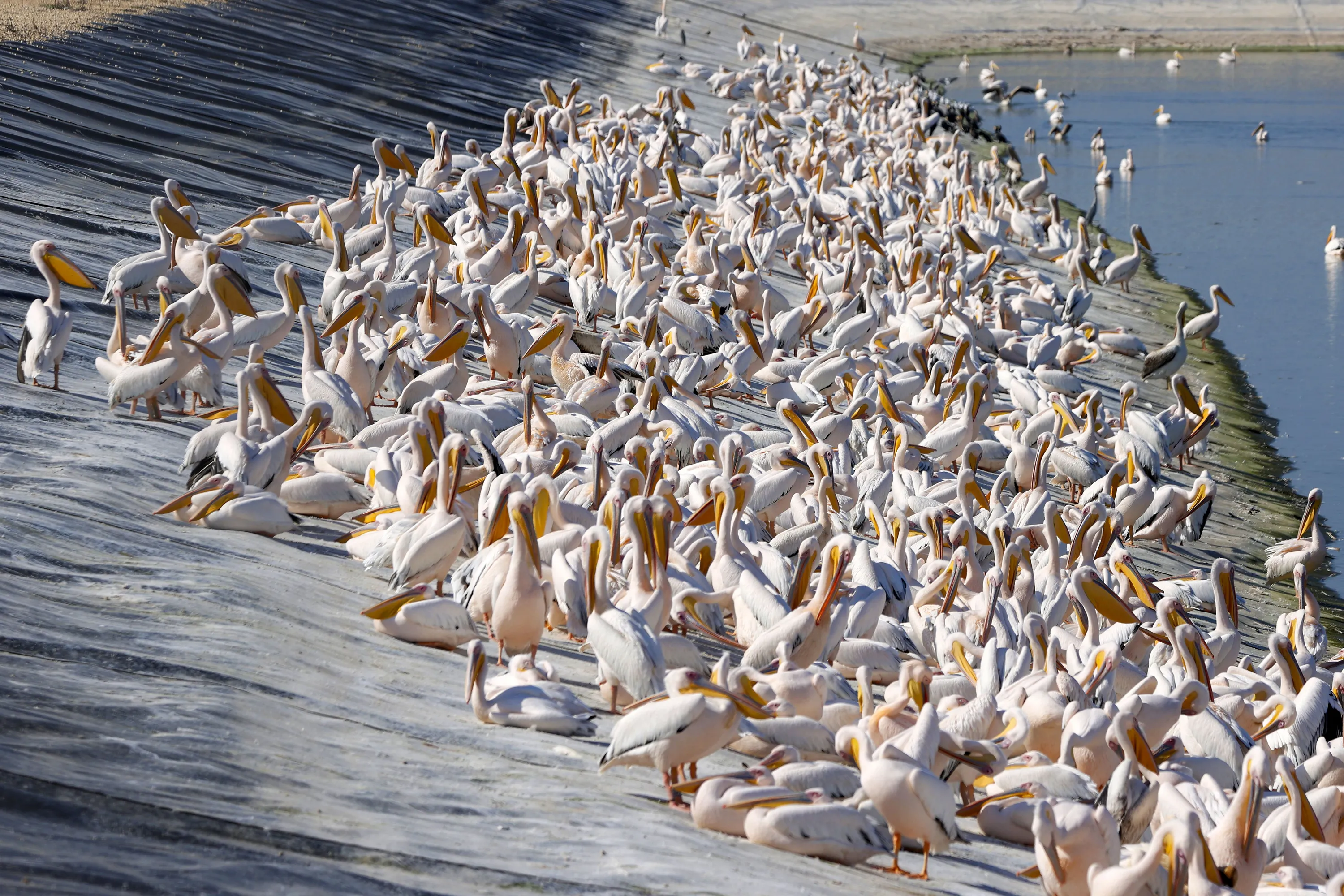 Great white pelicans are pictured at a reservoir in Mishmar HaSharon, north Israel's Mediterranean coastal city of Tel Aviv, on November 19, 2020. Thousands of migrant Pelicans pass though Israel on their way to Africa then again when they return to Europe in the summer. (Photo by Jack Guez/AFP Photo)