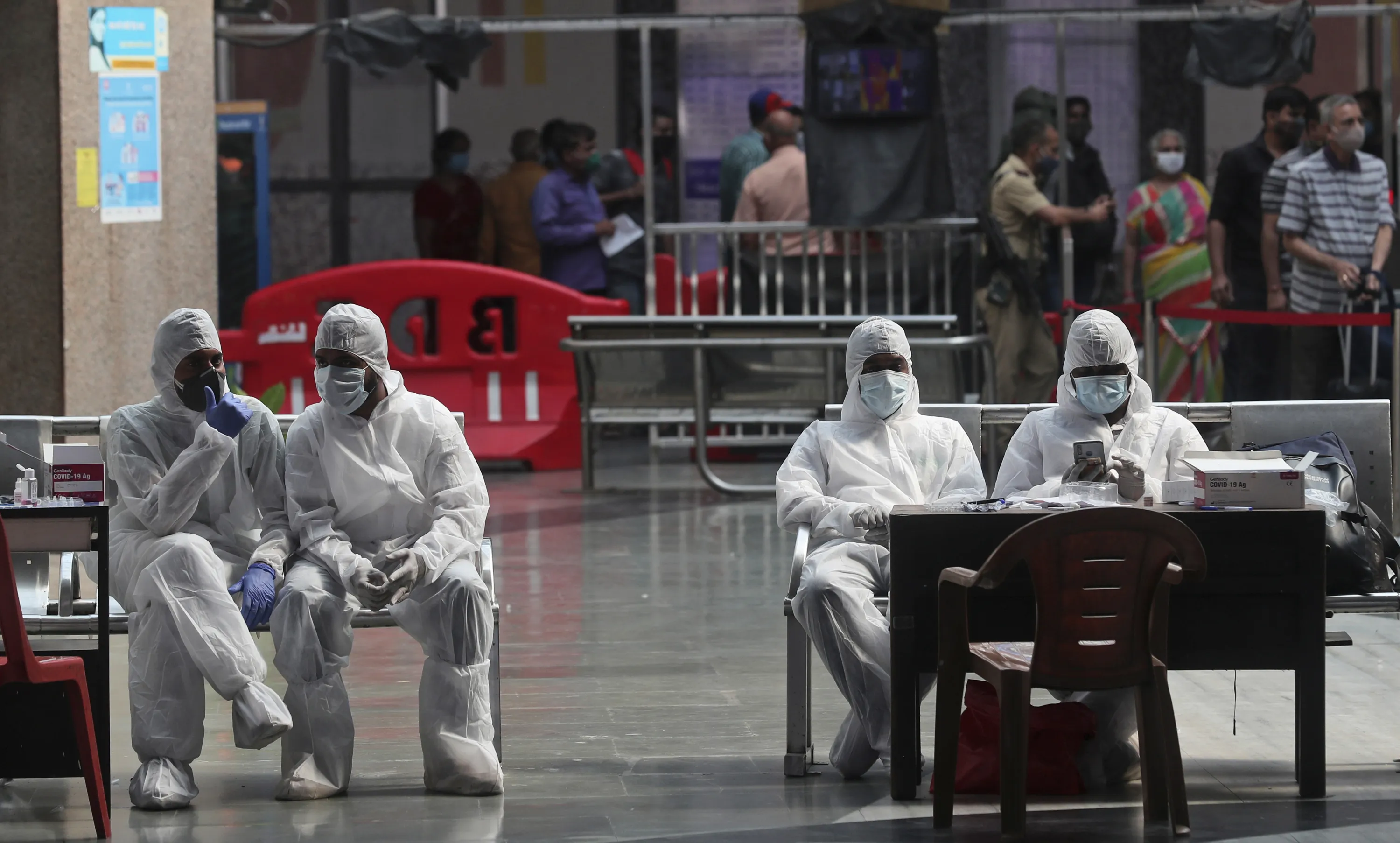 Health workers take a break from taking nasal swab samples from passengers to test for for COVID-19 at a train station in Mumbai, India, Friday, November 27, 2020. India has more than 9 million cases of coronavirus, second behind the United States. (Photo by Rafiq Maqbool/AP Photo)