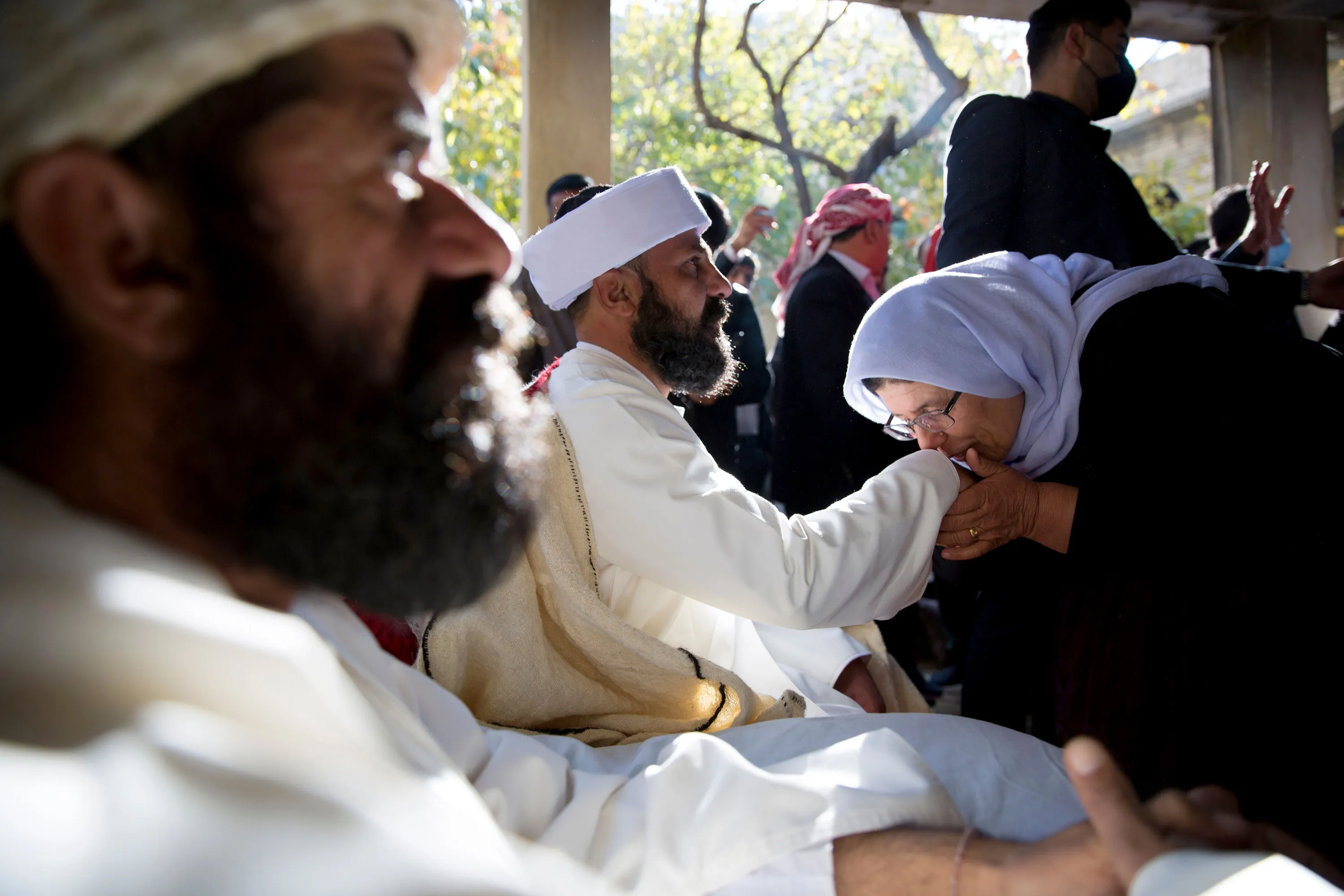 An elderly Yazidi woman kisses the hand of new Yazidi spiritual leader, also known as Baba Sheikh, Ali Elias Haji Nasir during the inauguration ceremony at Lalish Temple, south east of Duhok, Kurdistan region, Iraq, 18 November 2020. Sheikh Ali Elias Haji Nasir was appointed as the new spiritual leader of Yazidi minority group succeeding the late Khartu Hajji Ismael who died in early October at the age of 87. Nasir, 41, was chosen following consultations among family members, Yazidi tribes and the Yazidi Supreme Spiritual Council. The inauguration ceremony was held at the Lalish Temple, the holiest shrine of the Yazidis that was recently nominated on the UNESCO World Heritage List, and which contains the mausoleum of Sheikh Adi ibn Musafir, the 12th-century founder of Yazidism. There are over one million Yazidis worldwide, the majority of which live in Iraq, mainly in the Nineveh and Duhok governorates. The community was targeted by the Islamic State (IS) militants violence in Sinjar in 2014 forcing the displacement of thousands while women were forced into sexual slavery, trafficking and religious conversion. (Photo by Gailan Haji/EPA/EFE/Rex Features/Shutterstock)