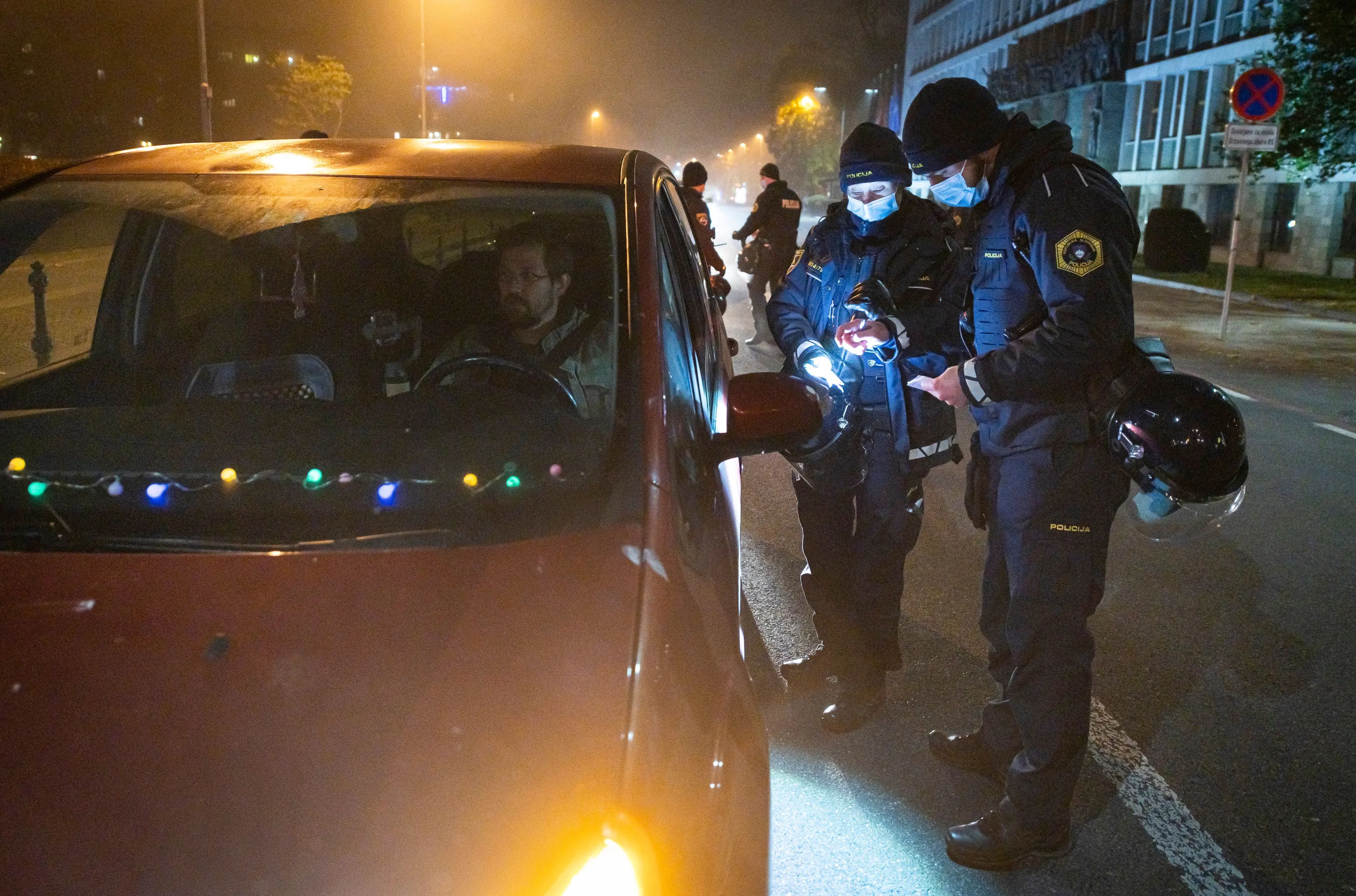 Slovenian police officers check the documents of a driver during a rally in front of the Slovenian Parliament to demand the resignation of the government in Ljubljana, on November 27, 2020. (Photo by Jure Makovec/AFP Photo)