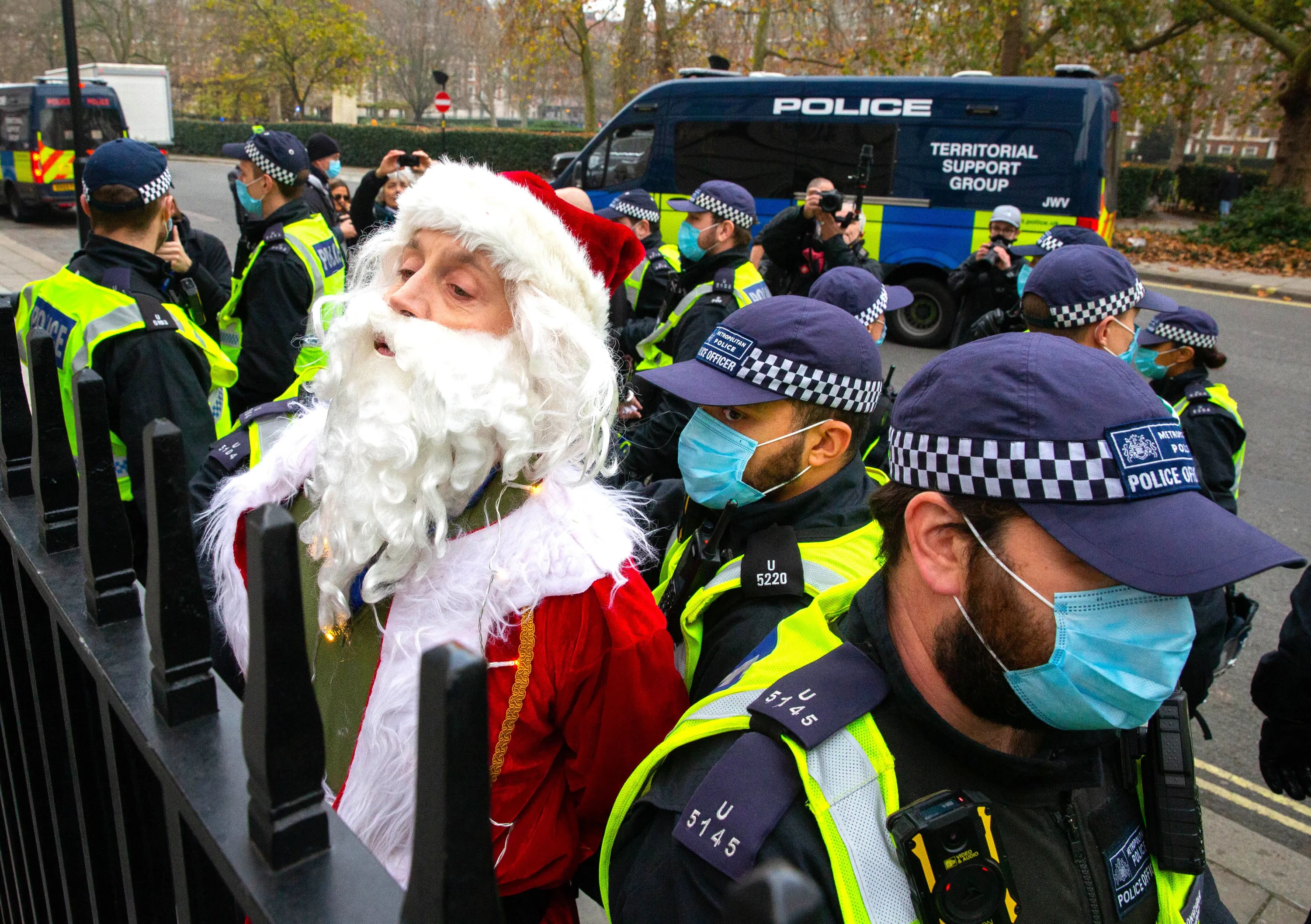 An anti-lockdown activist dressed as Father Christmas is arrested in Grosvenor Square during a demonstration in London, England, on November 28, 2020. London is to return to “Tier 2” or “high alert” covid-19 restrictions once the current England-wide coronavirus lockdown ends next Wednesday. All three of the tiers, assigned to local authorities across England, have been strengthened since the lockdown began on November 5, however, with the main impacts to be felt by the hospitality sector. (Photo by Mark Thomas/i-Images)
