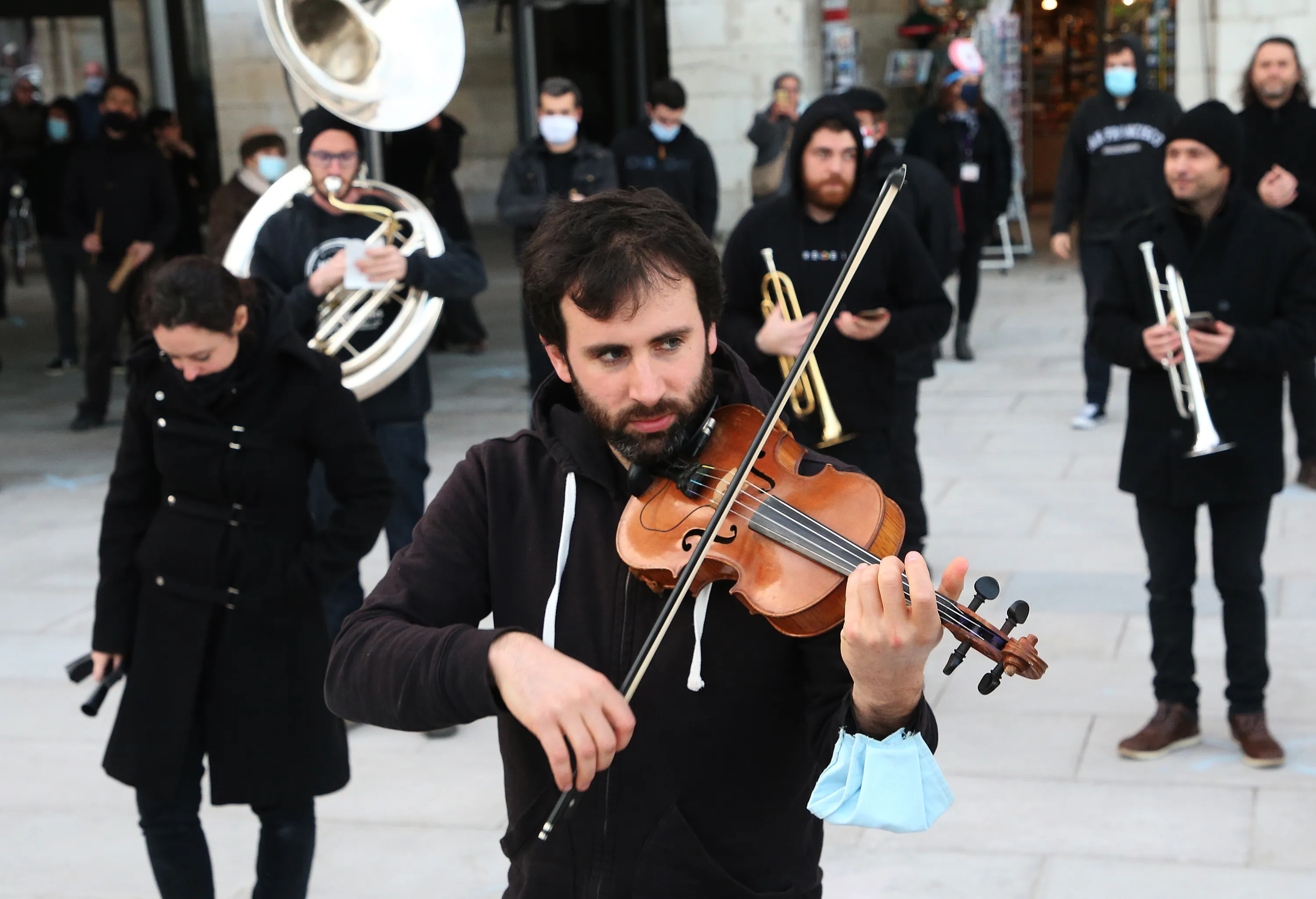 Professional musicians dressed in black perform on the Place of Freedom in Bayonne, southwestern France, Saturday, November 28, 2020, as they stage a protest against the nation wide lockdown. They are not authorized to resume their activities in the measures announced by President Macron. (Photo by Bob Edme/AP Photo)