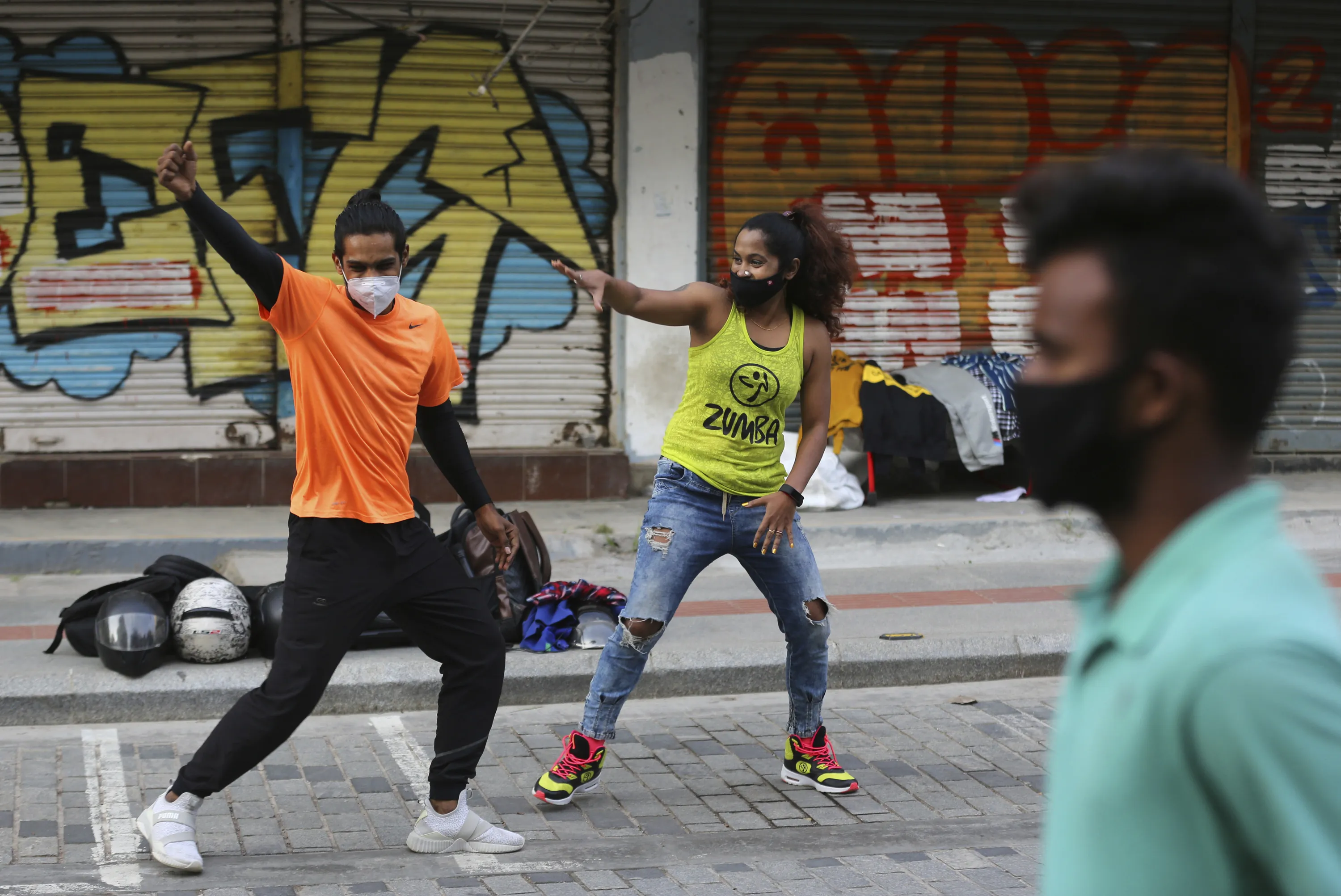 Artists wearing face masks as a precaution against the coronavirus perform on a street open to only pedestrians during weekends in Bengaluru, India, Saturday, November 28, 2020. The project called Clean Air Street initiative was launched earlier this month and will run through February, 2021. India has more than 9 million cases of coronavirus, second behind the United States. (Photo by Aijaz Rahi/AP Photo)