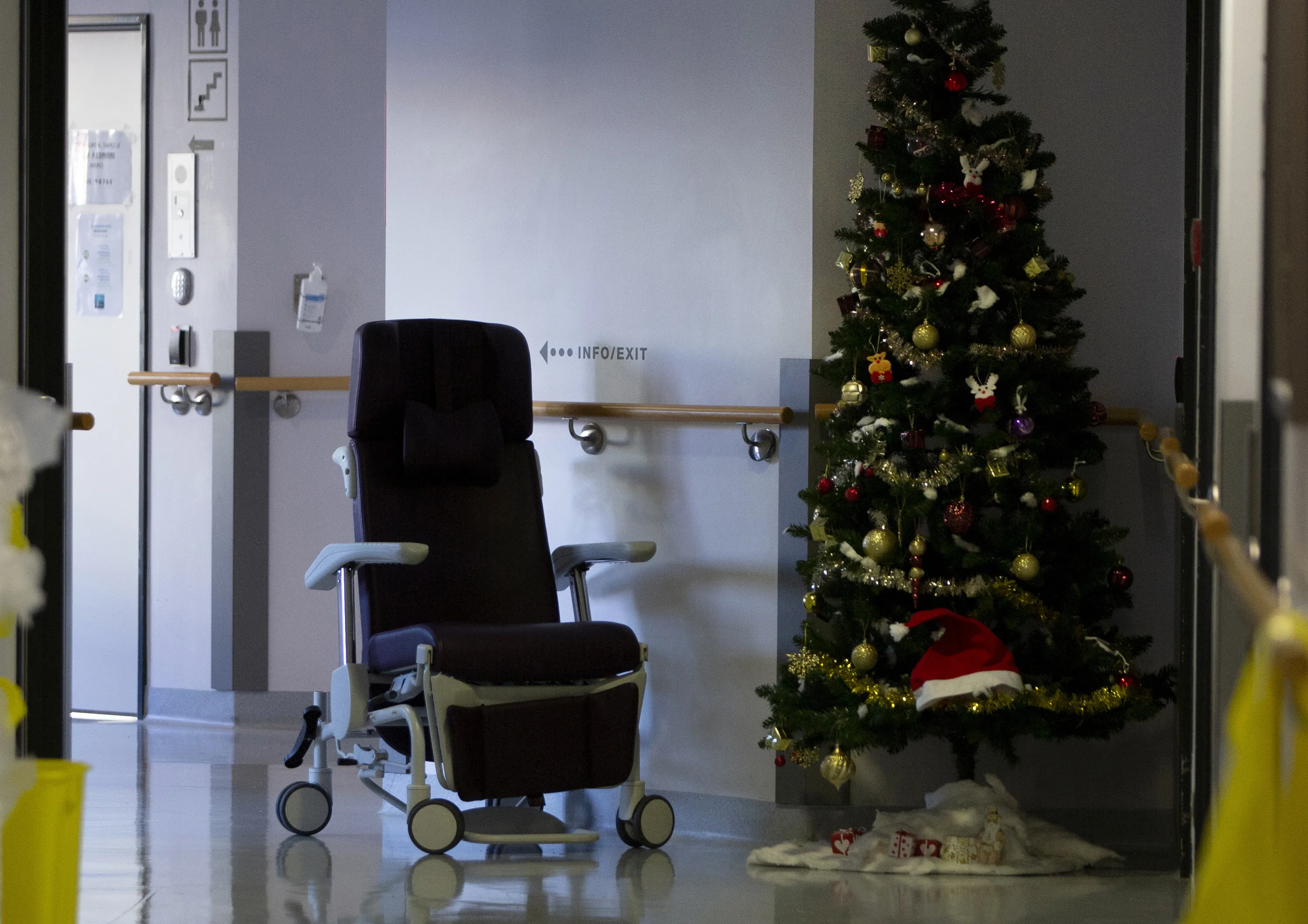 An empty chair is left in a hallway next to a Christmas tree in the COVID-19 ward at the St. Michiel Hospital in Brussels, Tuesday, November 24, 2020. Nations are struggling to reconcile cold medical advice with a holiday tradition that calls for big gatherings in often poorly ventilated rooms, where people chat, shout and sing together, providing an ideal conduit for a virus that has killed over 350,000 people in Europe so far. (Photo by Virginia Mayo/AP Photo)