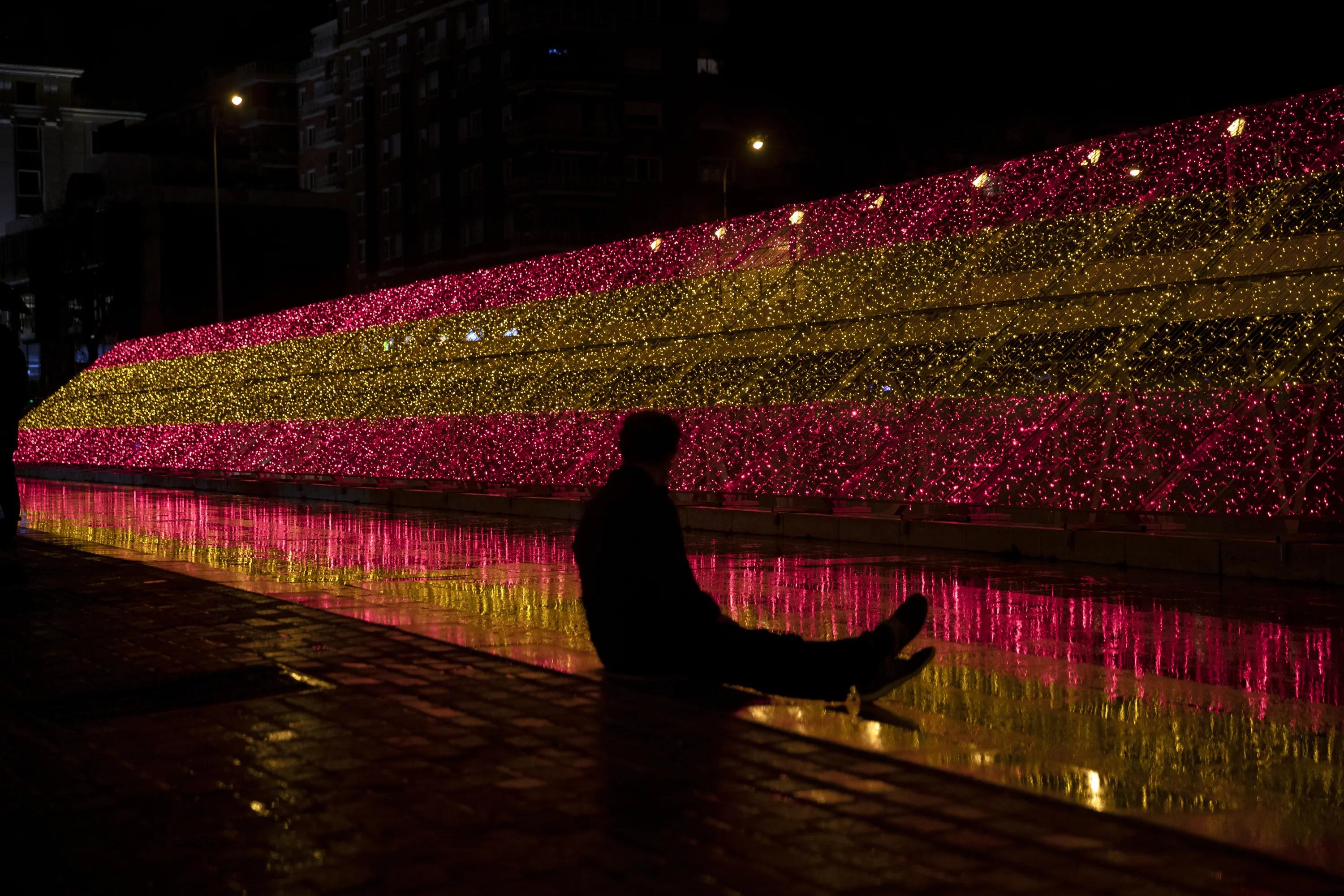 A man sits in front of a bank of Christmas lights in the colors of the Spanish flag in Madrid, Spain, Friday, November 27, 2020. People are waiting to see what restrictions will be in place over Christmas and the New Year as Spanish regions are continuing to adjust their various limitations against the coronavirus pandemic. (Photo by Paul White/AP Photo)