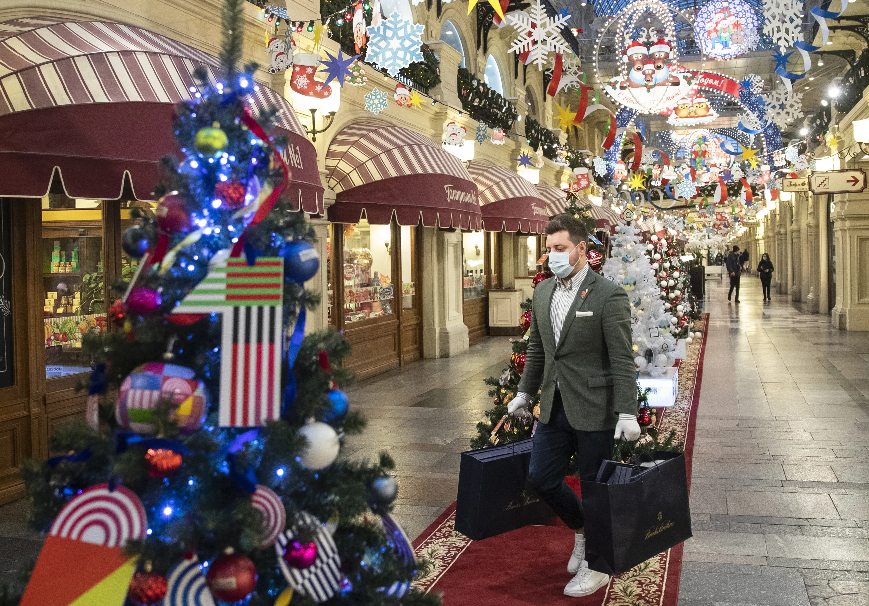 In this Monday, November 23, 2020 file photo, a man wearing face mask and gloves to protect against coronavirus carries purchases among as the GUM State Department store is decorated for Christmas and New Year celebrations in Moscow, Russia. Nations are struggling to reconcile cold medical advice with a holiday tradition that calls for big gatherings in often poorly ventilated rooms, where people chat, shout and sing together, providing an ideal conduit for a virus that has killed over 350,000 people in Europe so far. (Photo by Pavel Golovkin/AP Photo/File)