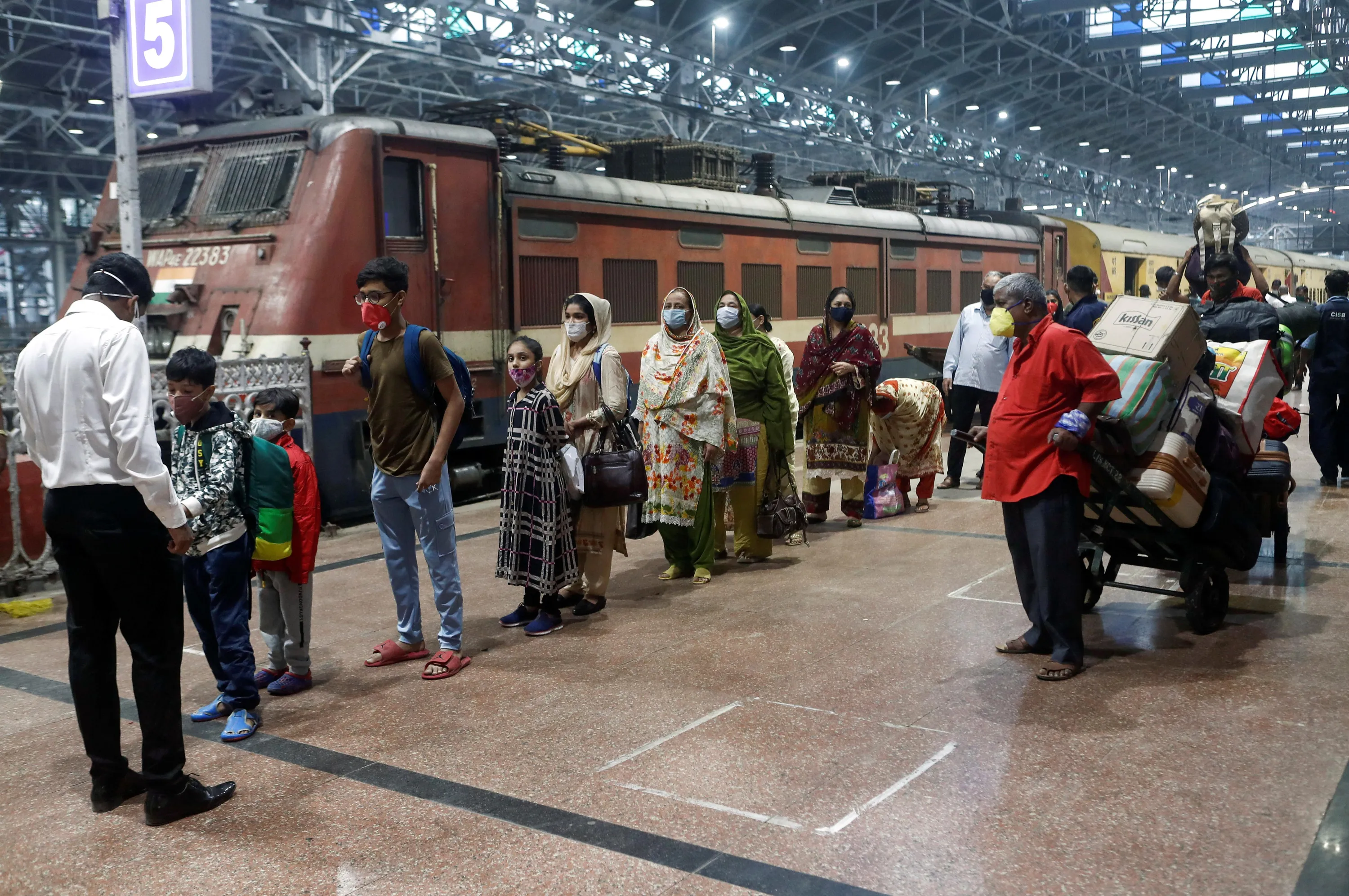 Passengers wait in line to get their temperature checked at a railway station, amid the spread of the coronavirus disease (COVID-19), in Mumbai, India on November 26, 2020. (Photo by Francis Mascarenhas/Reuters)