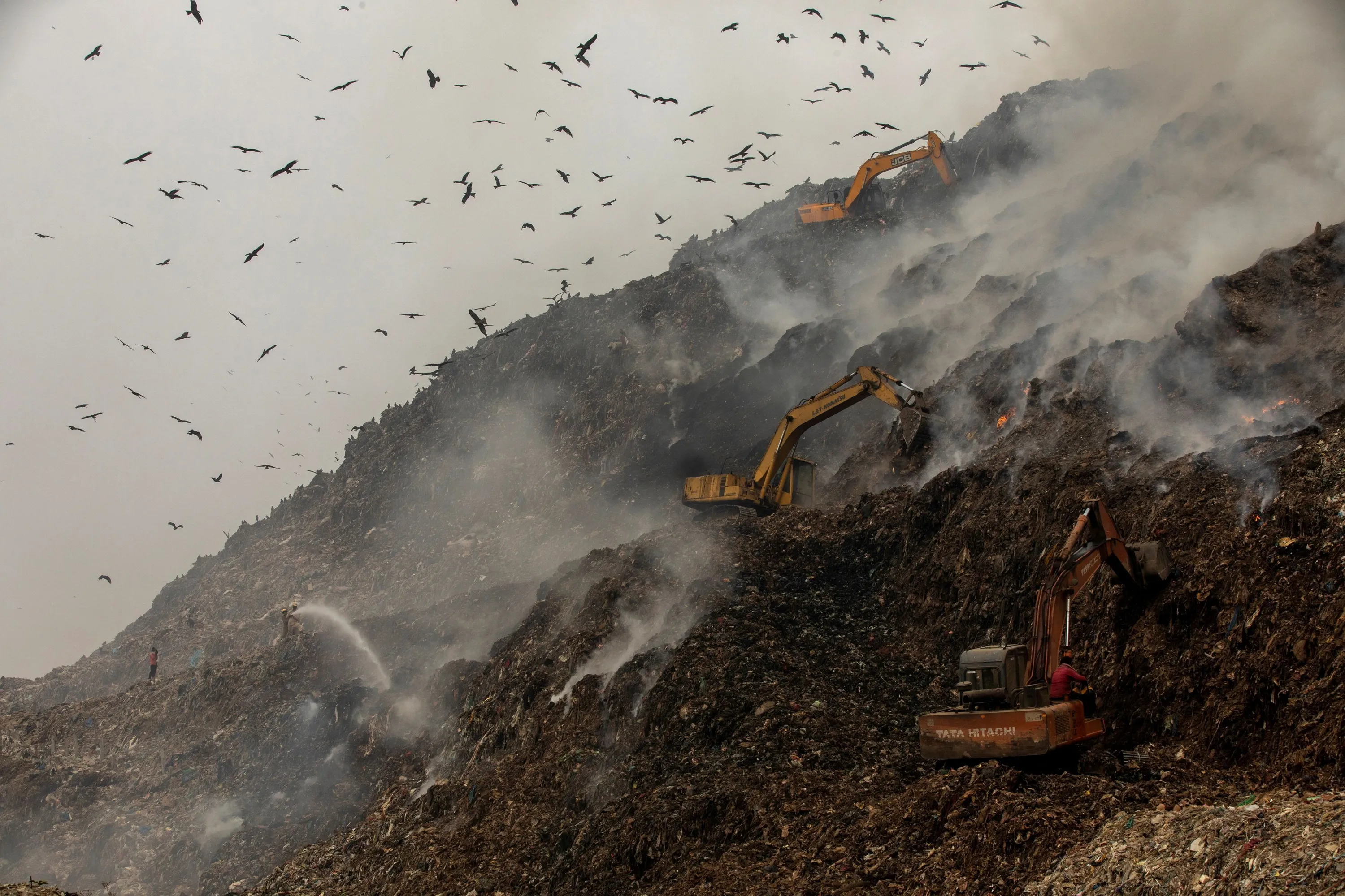 Firefighters and excavators try to douse fire as smoke billows from burning garbage at the Ghazipur landfill site in New Delhi, India, November 25, 2020. (Photo by Danish Siddiqui/Reuters)