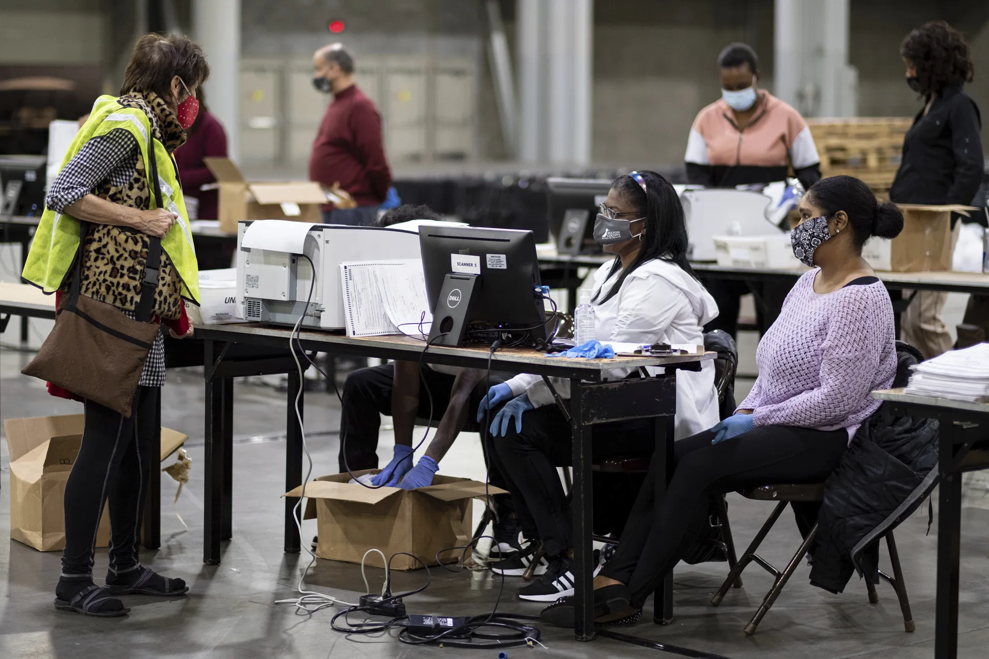 A GOP observer, left, watches as workers scan ballots as the Fulton County presidential recount gets under way Wednesday morning, November 25, 2020 at the Georgia World Congress Center in Atlanta. County election workers across Georgia have begun an official machine recount of the roughly 5 million votes cast in the presidential race in the state. The recount was requested by President Donald Trump after certified results showed him losing the state to Democrat Joe Biden by 12,670 votes, or 0.25%. (Photo by Ben Gray/AP Photo)