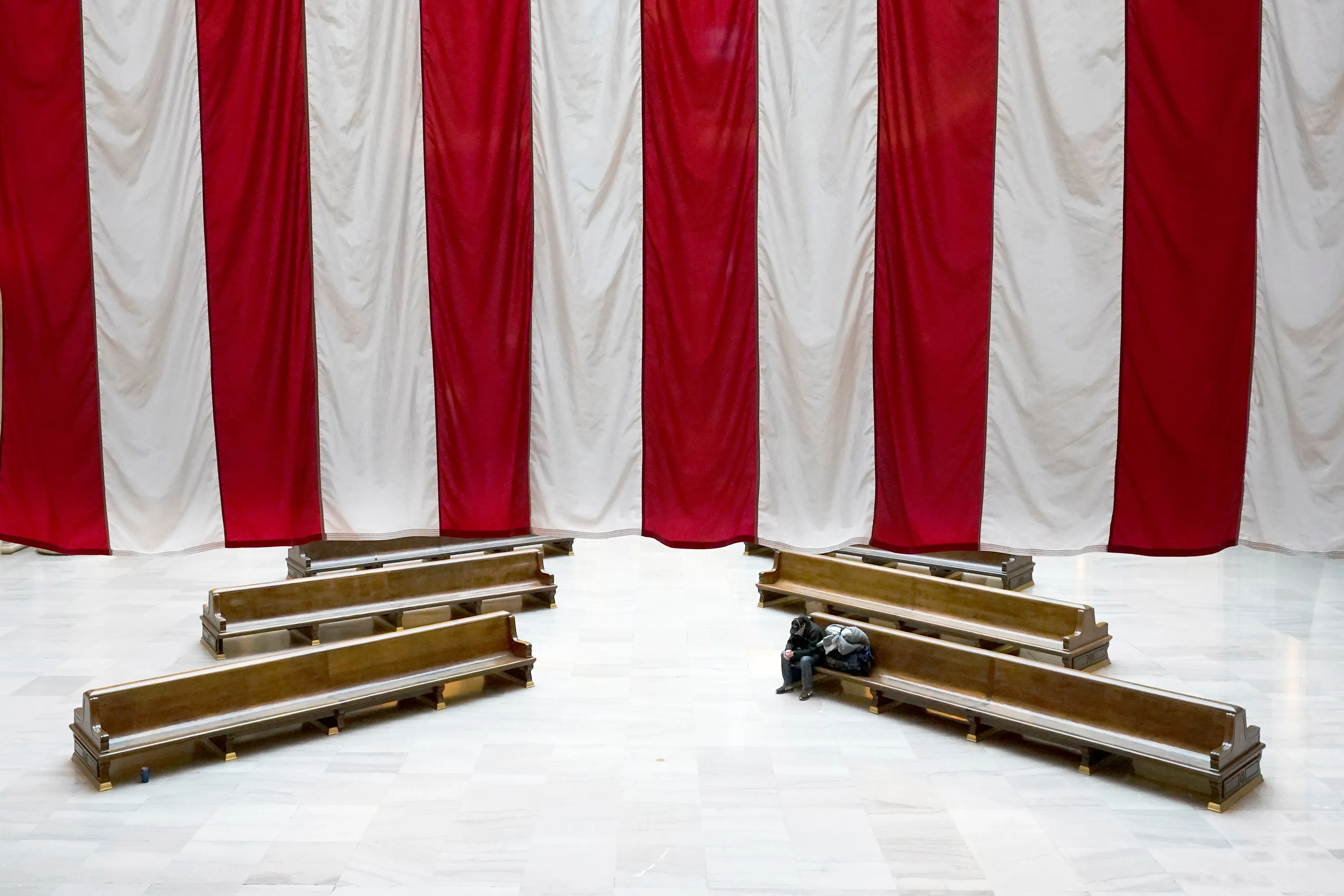 A lone rail traveler waits in the Grand Hall Wednesday, November 25, 2020, of Chicago's Union Station the day before Thanksgiving. (Photo by Charles Rex Arbogast/AP Photo)