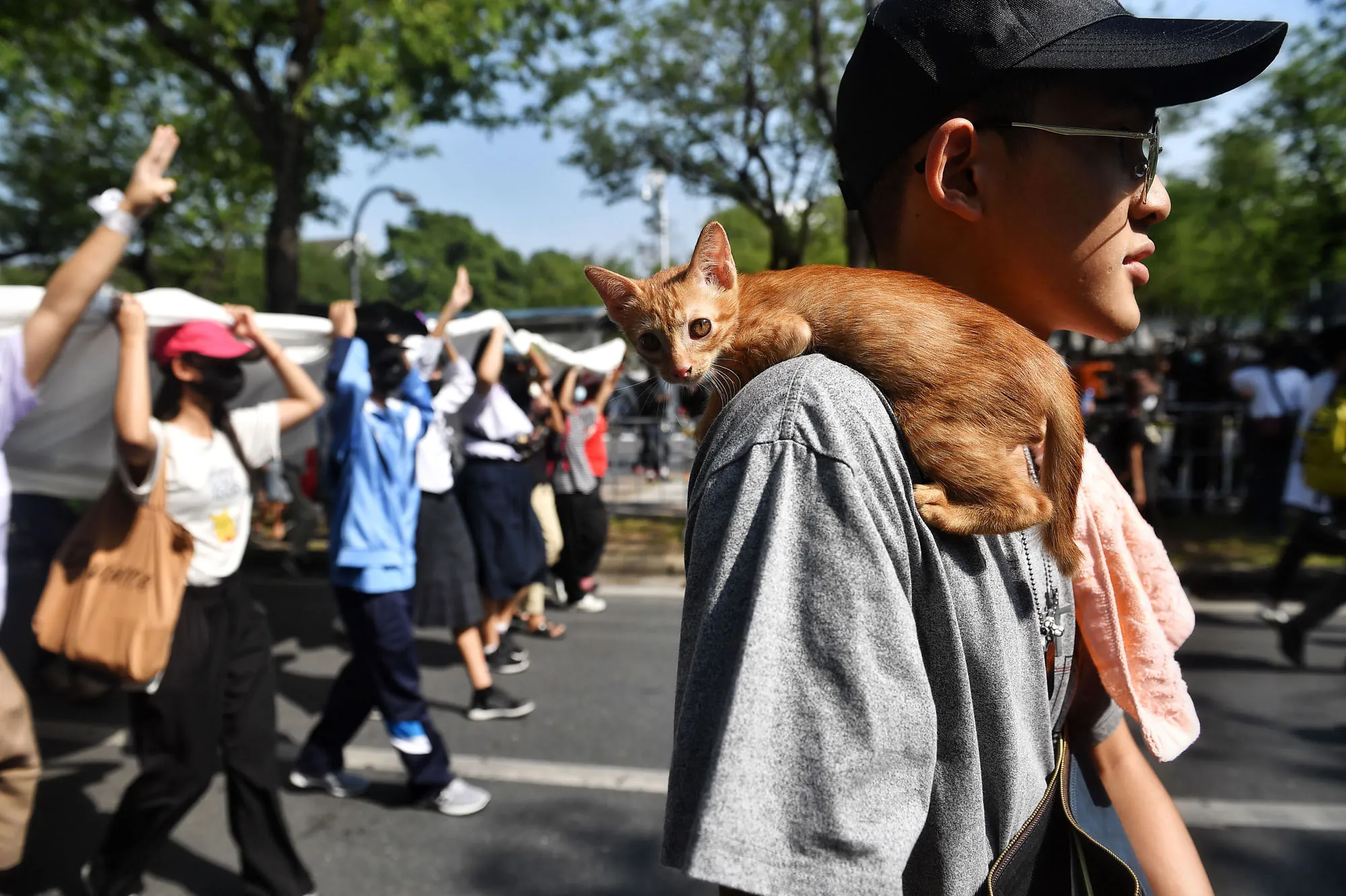 A cat sits on the shoulder of a pro-democracy protester taking part in an anti-government rally in Bangkok on November 14, 2020. (Photo by Lillian Suwanrumpha/AFP Photo)