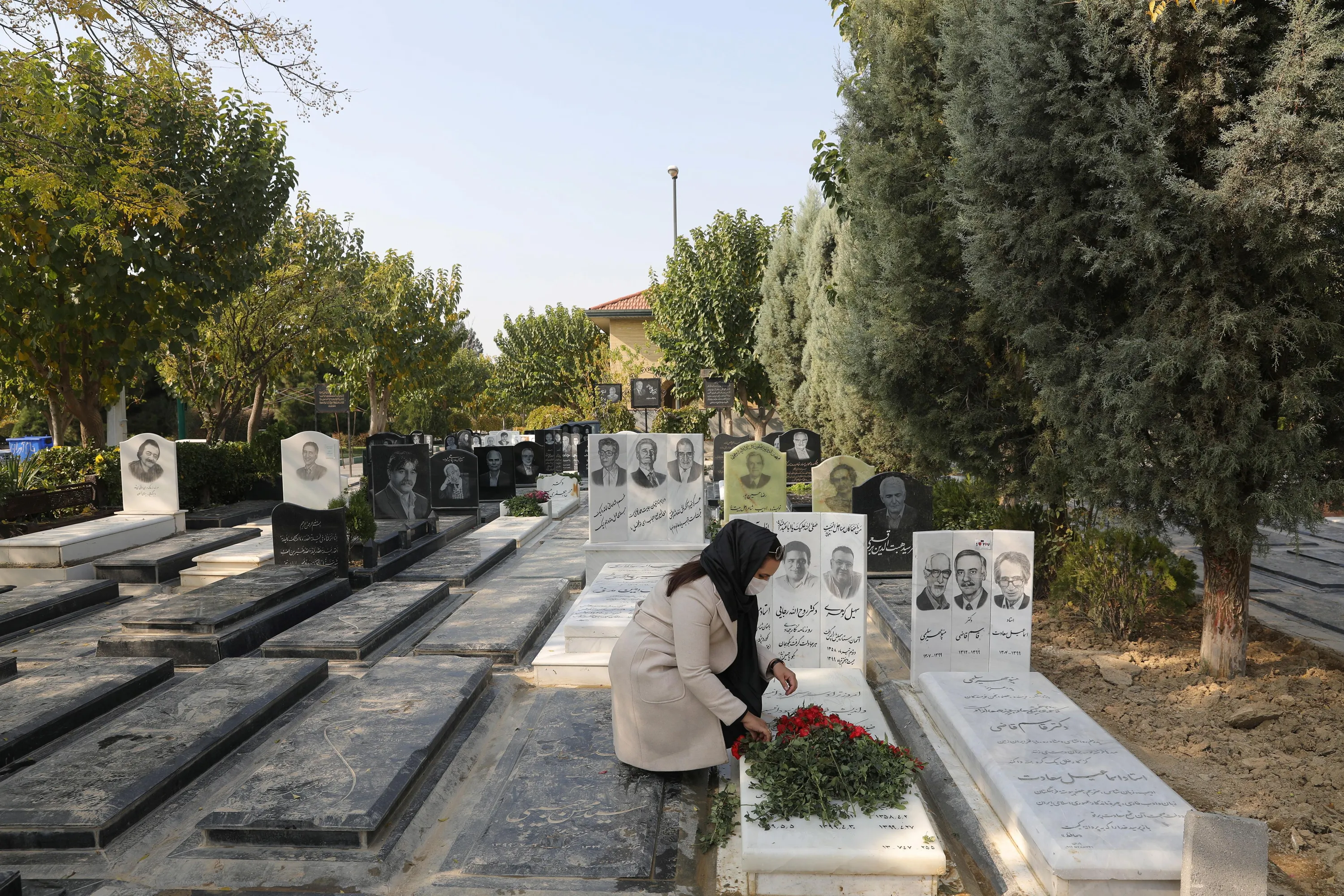 Ayat Hosseini, an Iranian woman who lost her husband, Soheil due to coronavirus, puts flowers on his grave at a cemetery in south of Tehran, Iran on November 18, 2020. (Photo by Majid Asgaripour/WANA (West Asia News Agency) via Reuters)
