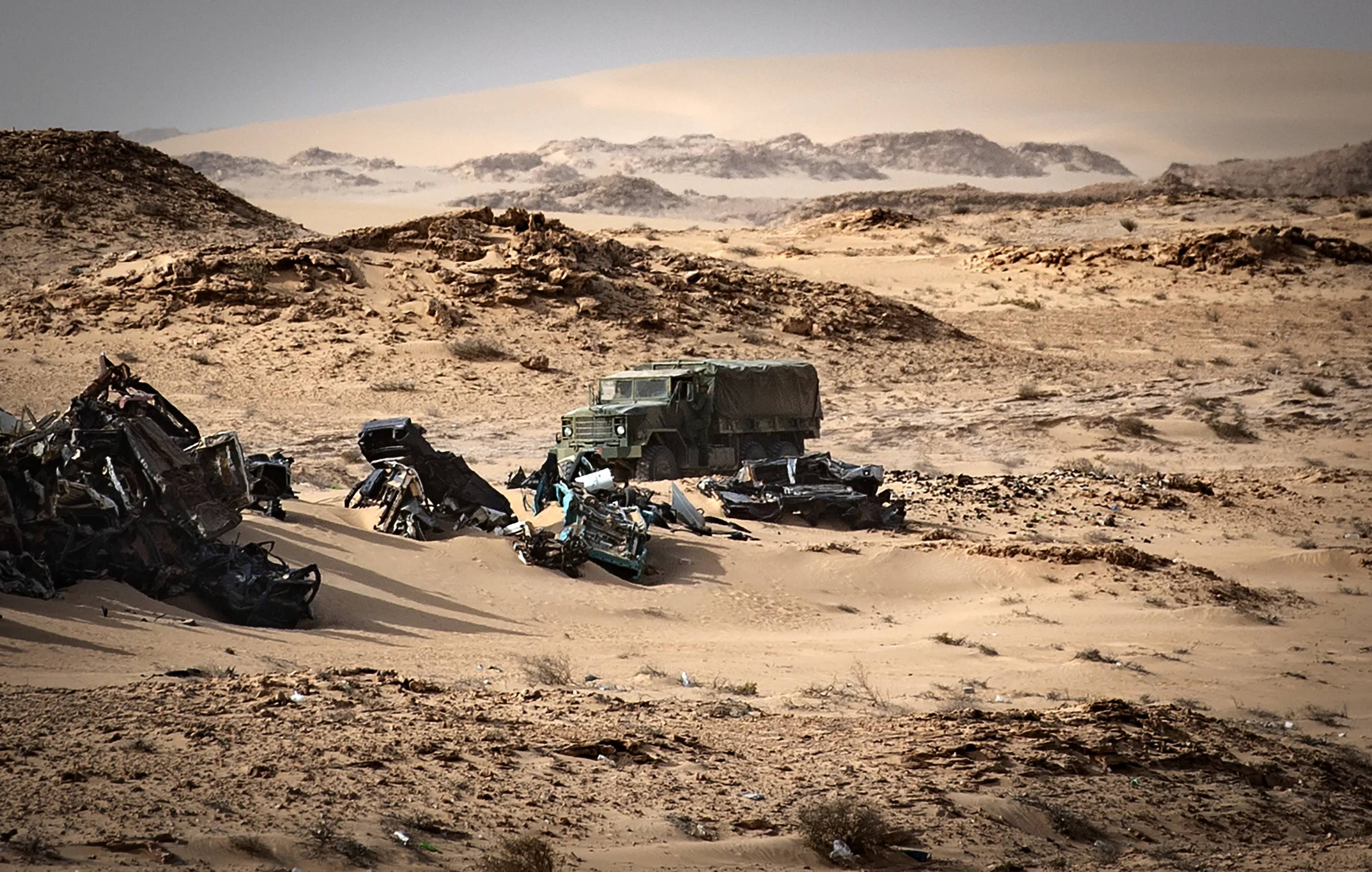 A Moroccan army vehicles drives past car wreckages in Guerguerat located in the Western Sahara, on November 24, 2020, after the intervention of the royal Moroccan armed forces in the area. Morocco in early November accused the Polisario Front of blocking the key highway for trade with the rest of Africa, and launched a military operation to reopen it. (Photo by Fadel Senna/AFP Photo)