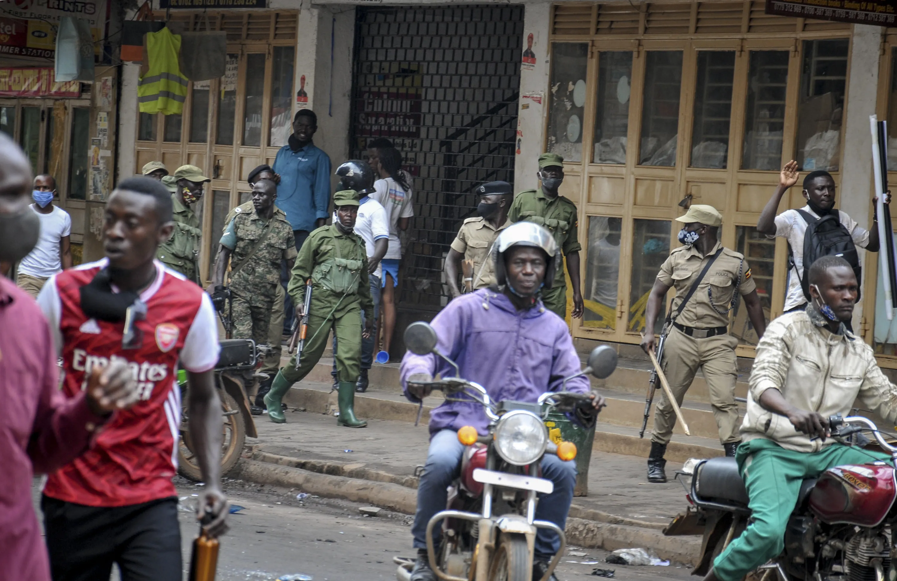 Ugandan security forces patrol on a street in Kampala, Uganda Thursday, November 19, 2020. The death toll from protests over the latest arrest of Ugandan opposition presidential hopeful and musician Bobi Wine has risen to 16, police said Thursday, as a second day of demonstrations continued in the country's worst unrest in a decade. (Photo by AP Photo/Stringer)