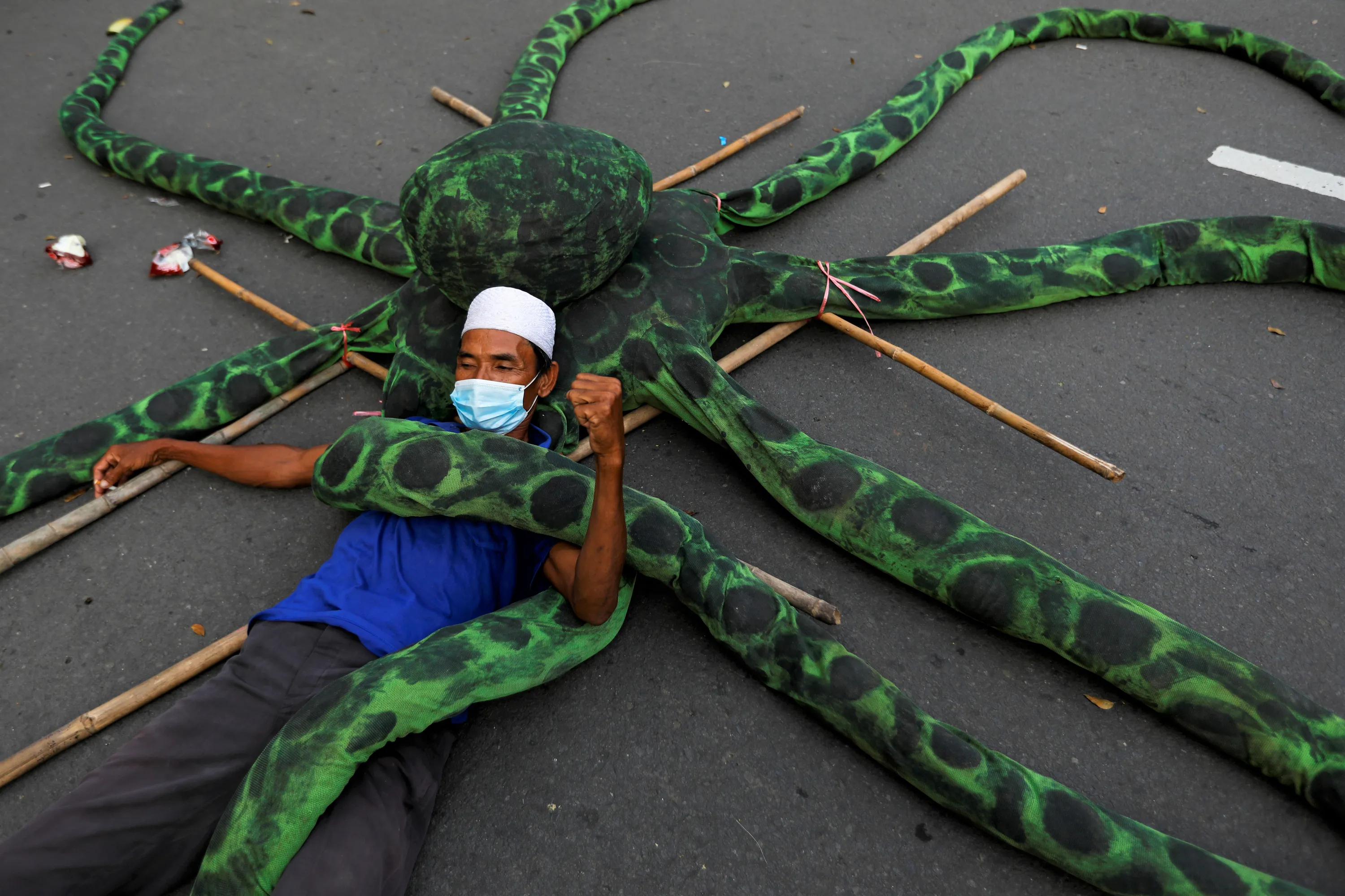 A fisherman wearing a protective mask lies on an artificial octopus during a protest against the government's labor reforms in a “job creation” bill in Jakarta, Indonesia, November 10, 2020. (Photo by Willy Kurniawan/Reuters)
