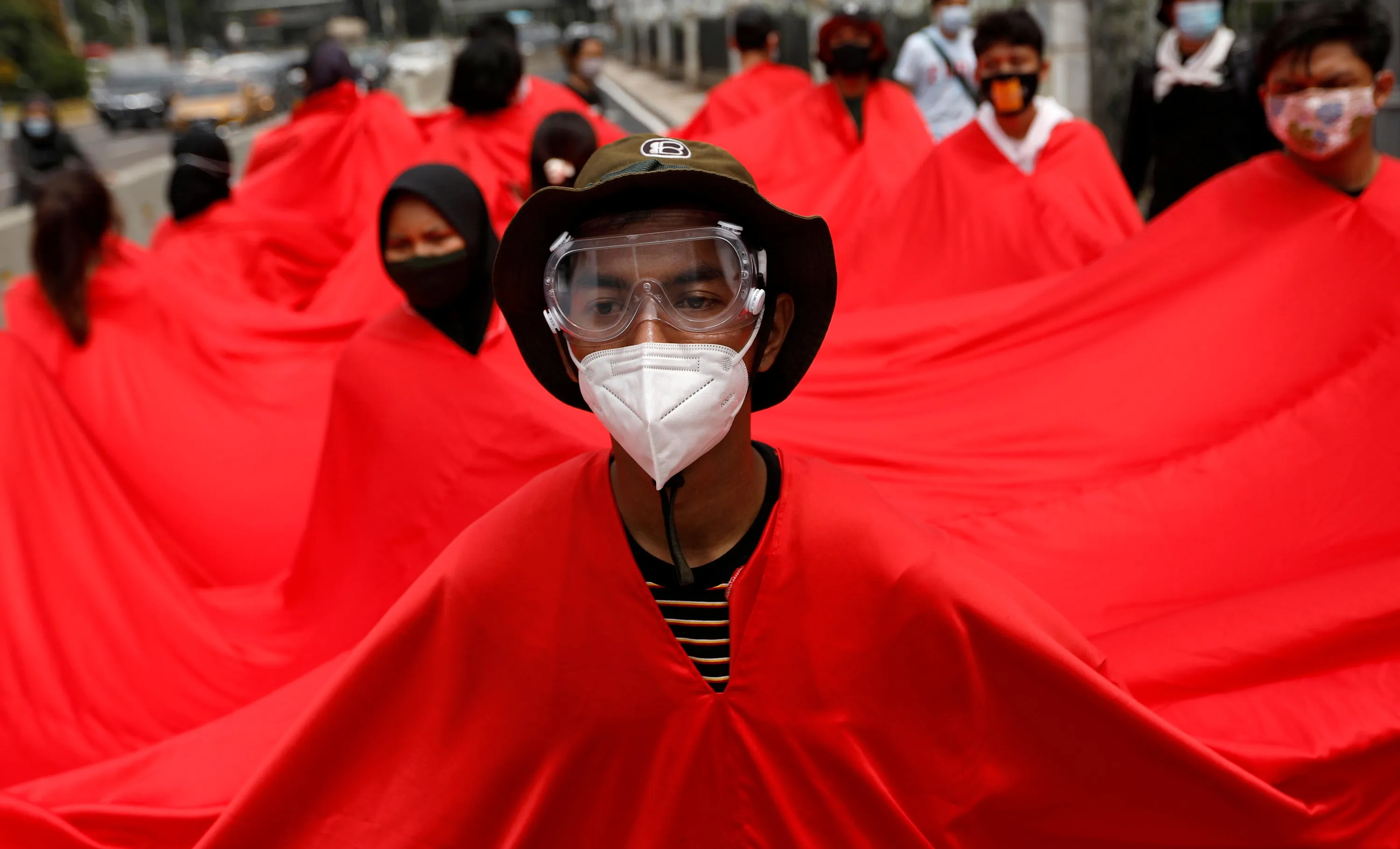 Youth activists wearing red cloth take part in a protest during the Asia Climate Rally, outside the Indonesian Ministry of Energy and Mineral Resources in Jakarta, Indonesia, November 27, 2020. (Photo by Willy Kurniawan/Reuters)