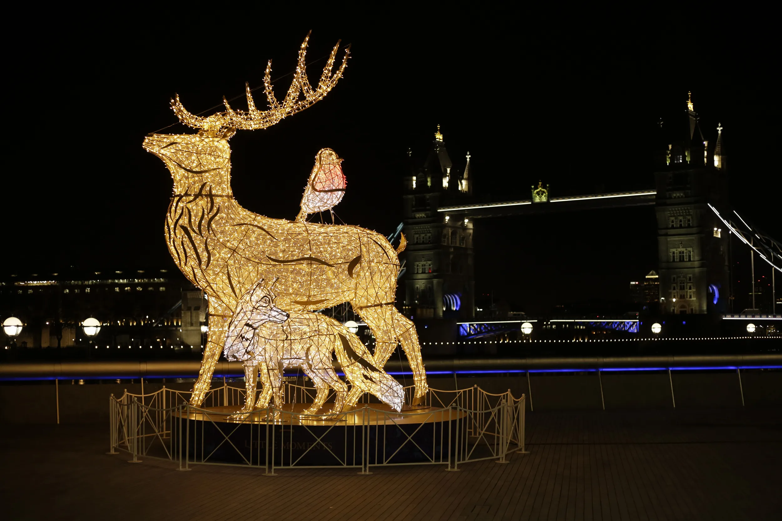 A Christmas lights sculpture stands backdropped by Tower Bridge, during England's second coronavirus lockdown, Thursday, November 26, 2020. The visual effects in blue and white are to thank National Health Service (NHS) and key workers for all they did during this year's coronavirus outbreak. (Photo by Matt Dunham/AP Photo)