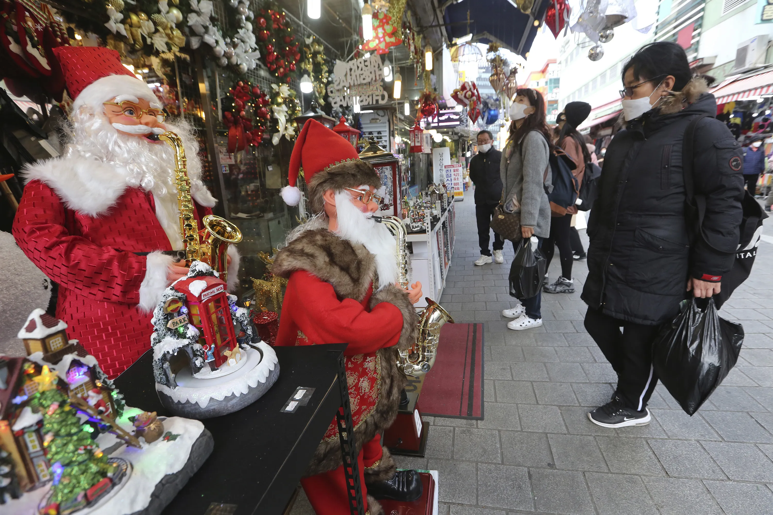 People wearing face masks as a precaution against the coronavirus watch Christmas decorations at a store in Seoul, South Korea, Friday, November 27, 2020. South Korea's daily virus tally hovered above 500 for the second straight day, as the country's prime minister urged the public to stay home this weekend to contain a viral resurgence. (Photo by Ahn Young-joon/AP Photo)