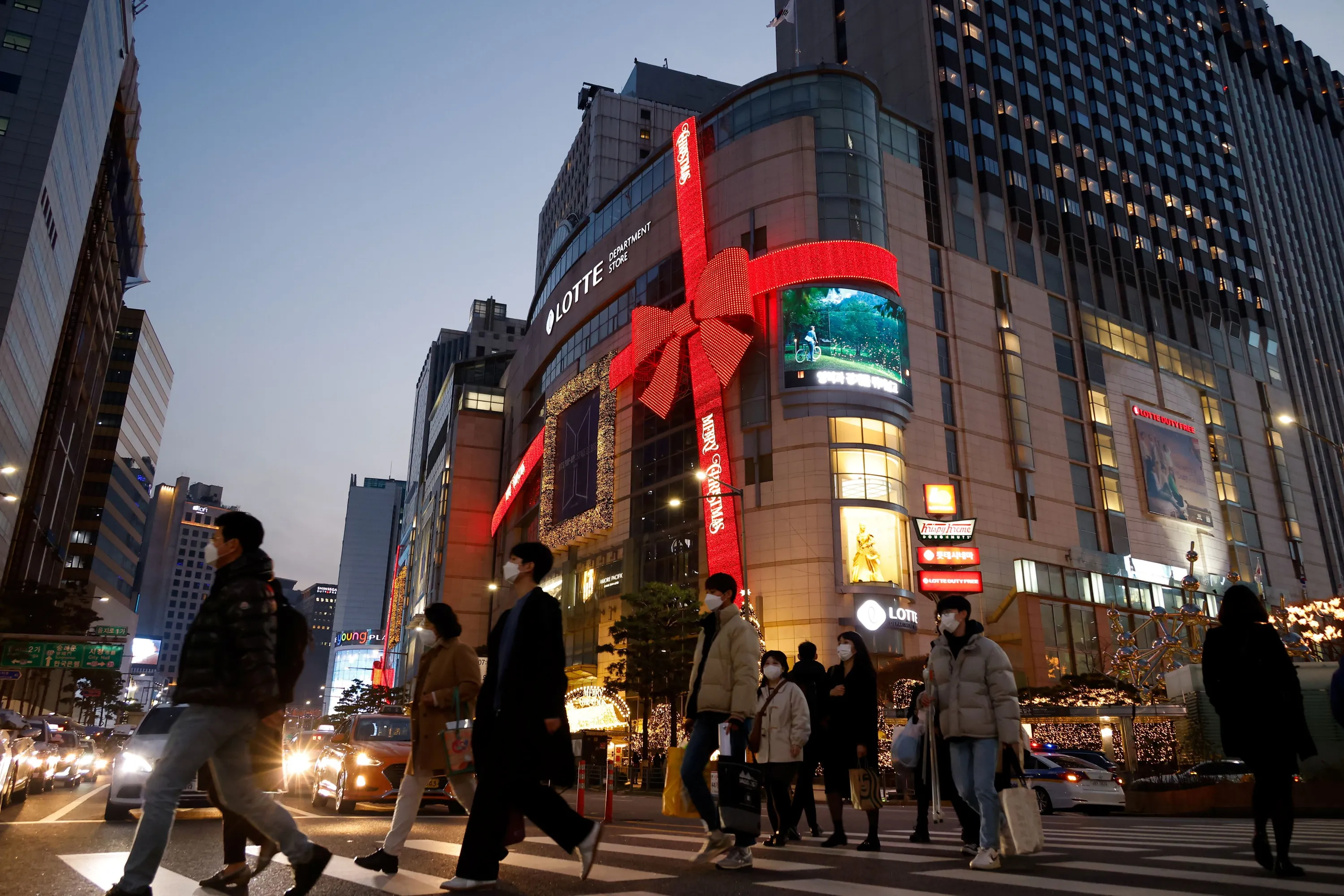 People walk on a zebra crossing in front of a department store in Christmas season themed decorations amid the coronavirus disease (COVID-19) pandemic in Seoul, South Korea, November 26, 2020. (Photo by Kim Hong-Ji/Reuters)