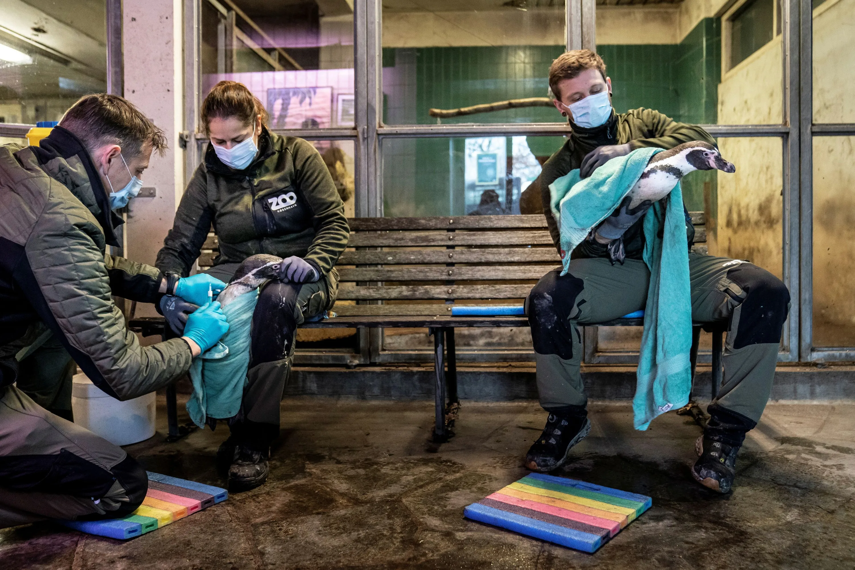 Humboldt penguins at Copenhagen Zoo are being vaccinated on December 1, 2020. Once a year, all Copenhagen Zoo's birds must undergo a health check and be vaccinated against the bird flu. (Photo by Mads Claus Rasmussen/Ritzau Scanpix/AFP Photo)