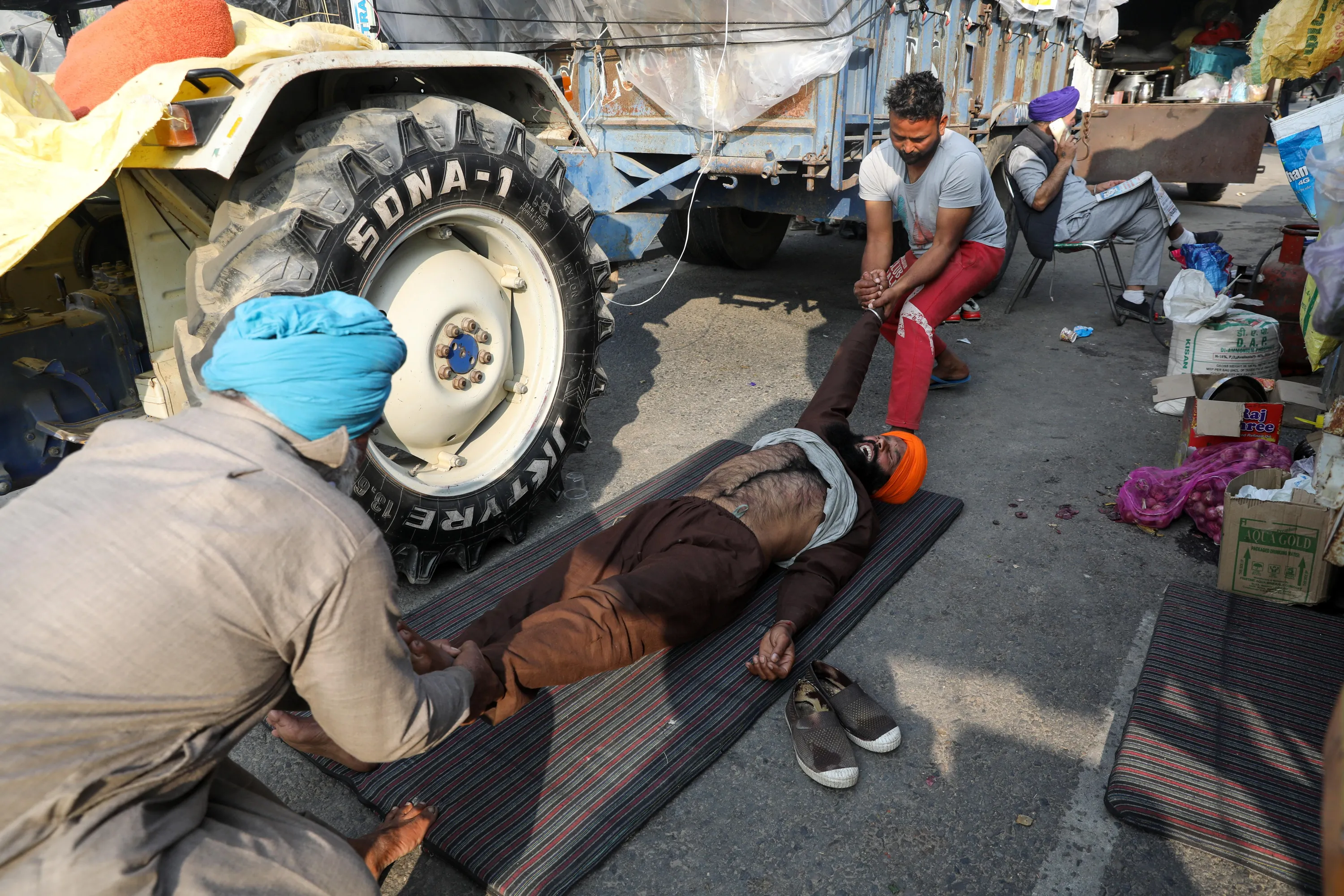 A farmer reacts as men pull his hand and leg at the site of a protest against the newly passed farm bills, at Singhu border near Delhi, India on December 2, 2020. (Photo by Anushree Fadnavis/Reuters)
