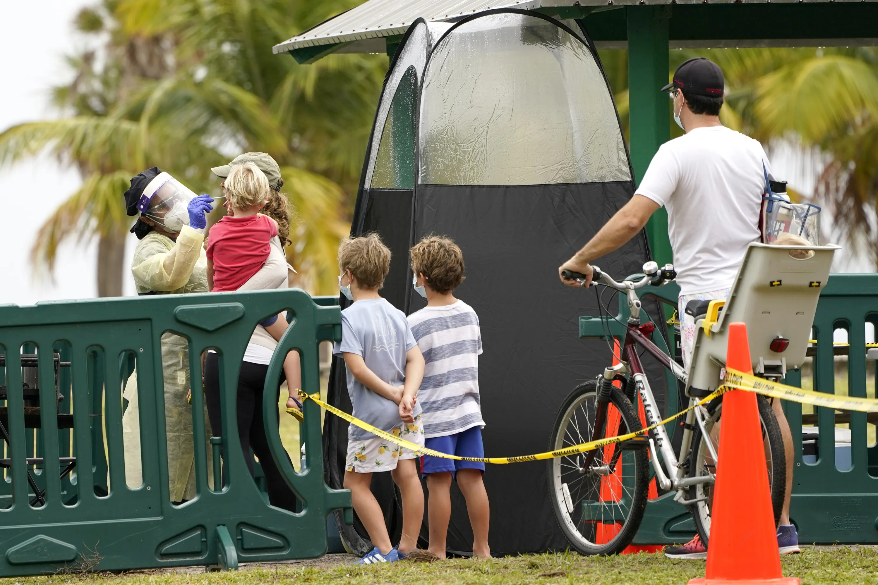 A health care worker, left, administers a COVID-19 test at a mobile walk-up testing site at Crandon Park, Saturday, November 28, 2020, in Miami. (Photo by Lynne Sladky/AP Photo)