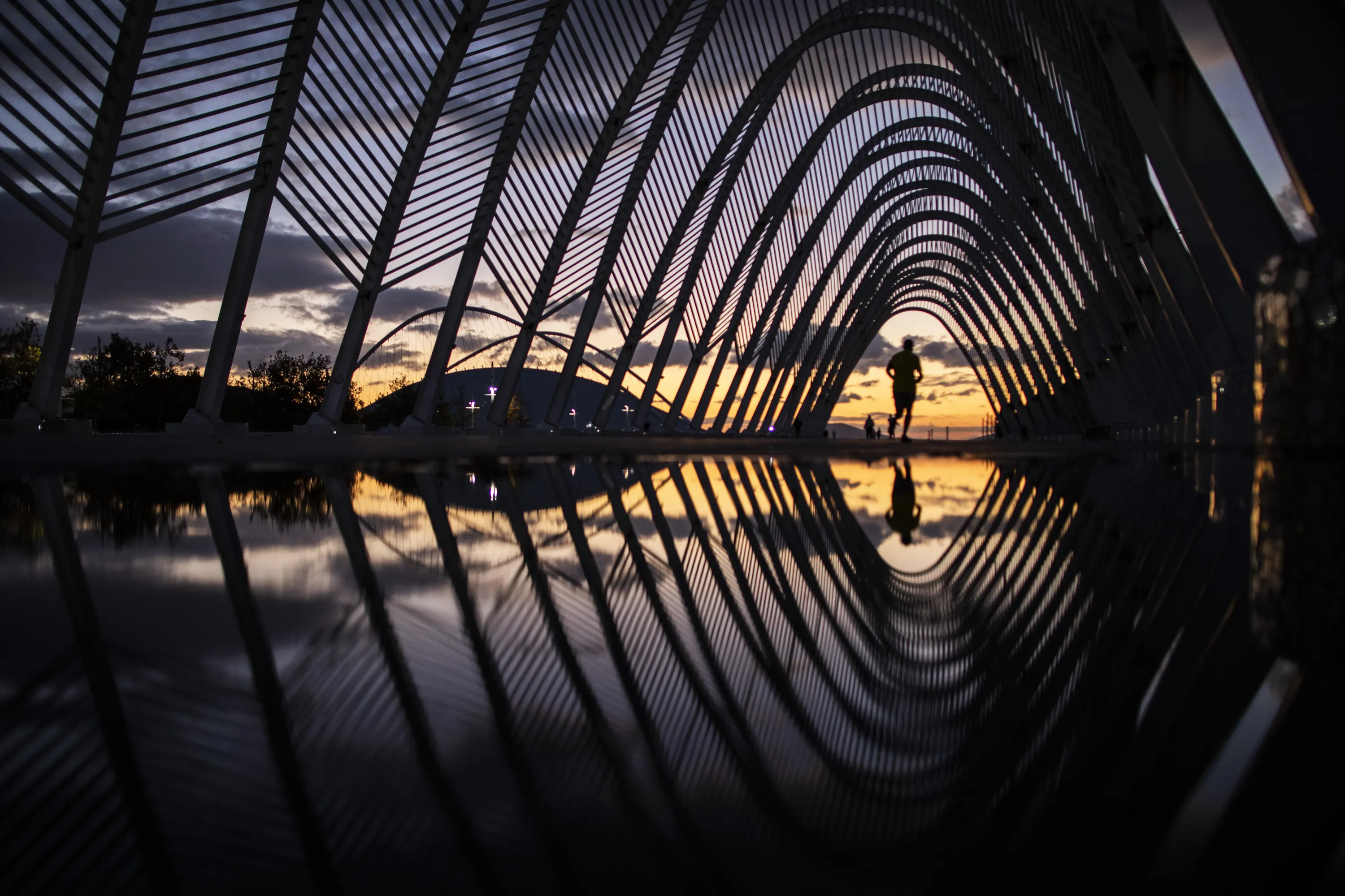 A man runs on a walkway of steel vaults, called the Agora, at the Athens Olympic Stadium complex as the sun sets, on Friday, November 20, 2020. The government imposed a second lockdown nationwide on Nov. 7, expanding regional restrictions, following a dramatic surge in COVID-19 cases (Photo by Petros Giannakouris/AP Photo)