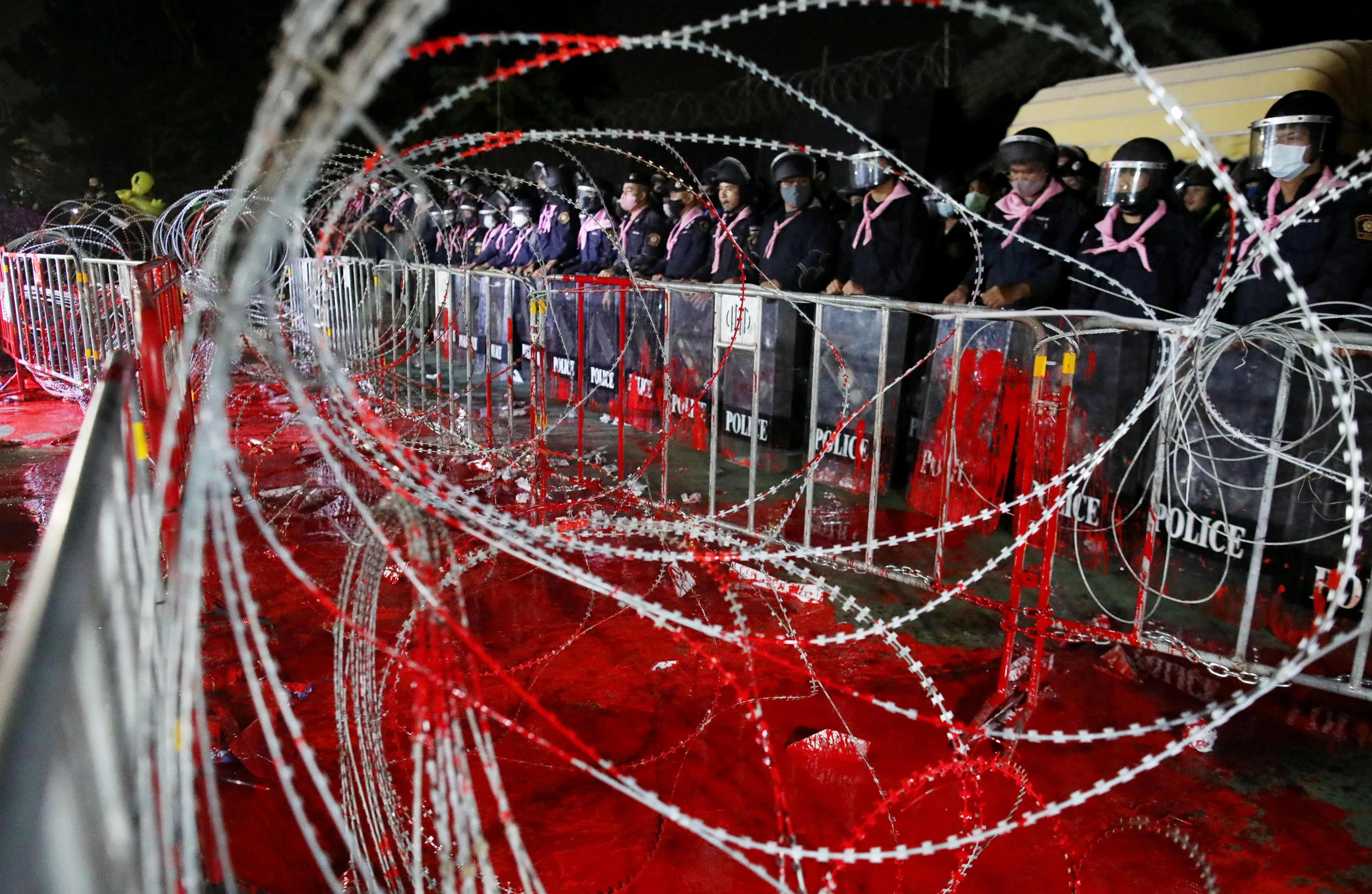 Riot police officers stand guard behind barb wires covered with red paint during a pro-democracy rally demanding Prime Minister Prayuth Chan-ocha to resign and reforms to the monarchy, at 11th Infantry Regiment, in Bangkok, Thailand, November 29, 2020. (Photo by Soe Zeya Tun/Reuters)