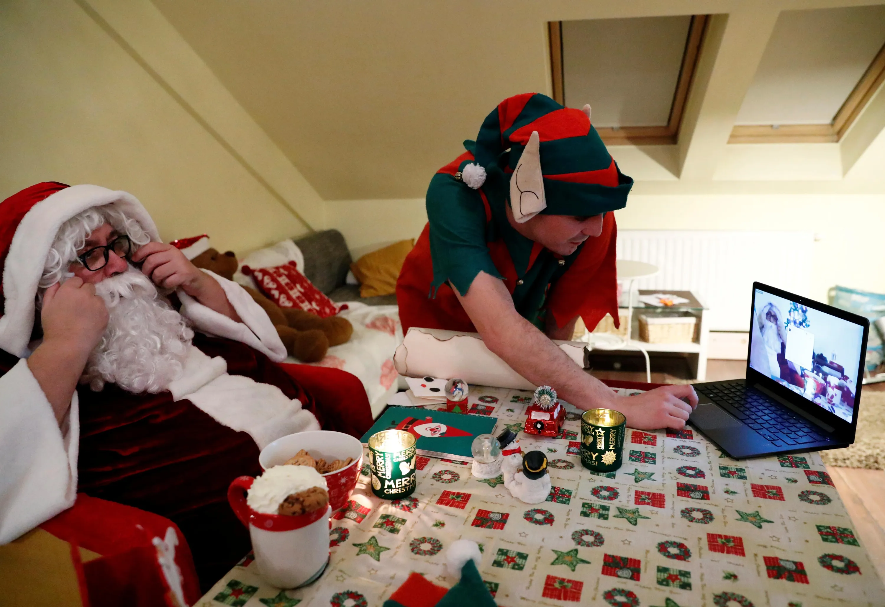 An assistant helps Pal Pillmayer, dressed as Santa Claus, as he prepares to interact with children by video chat, amid the coronavirus disease (COVID-19) outbreak in Budapest, Hungary, November 30, 2020. (Photo by Bernadett Szabo/Reuters)