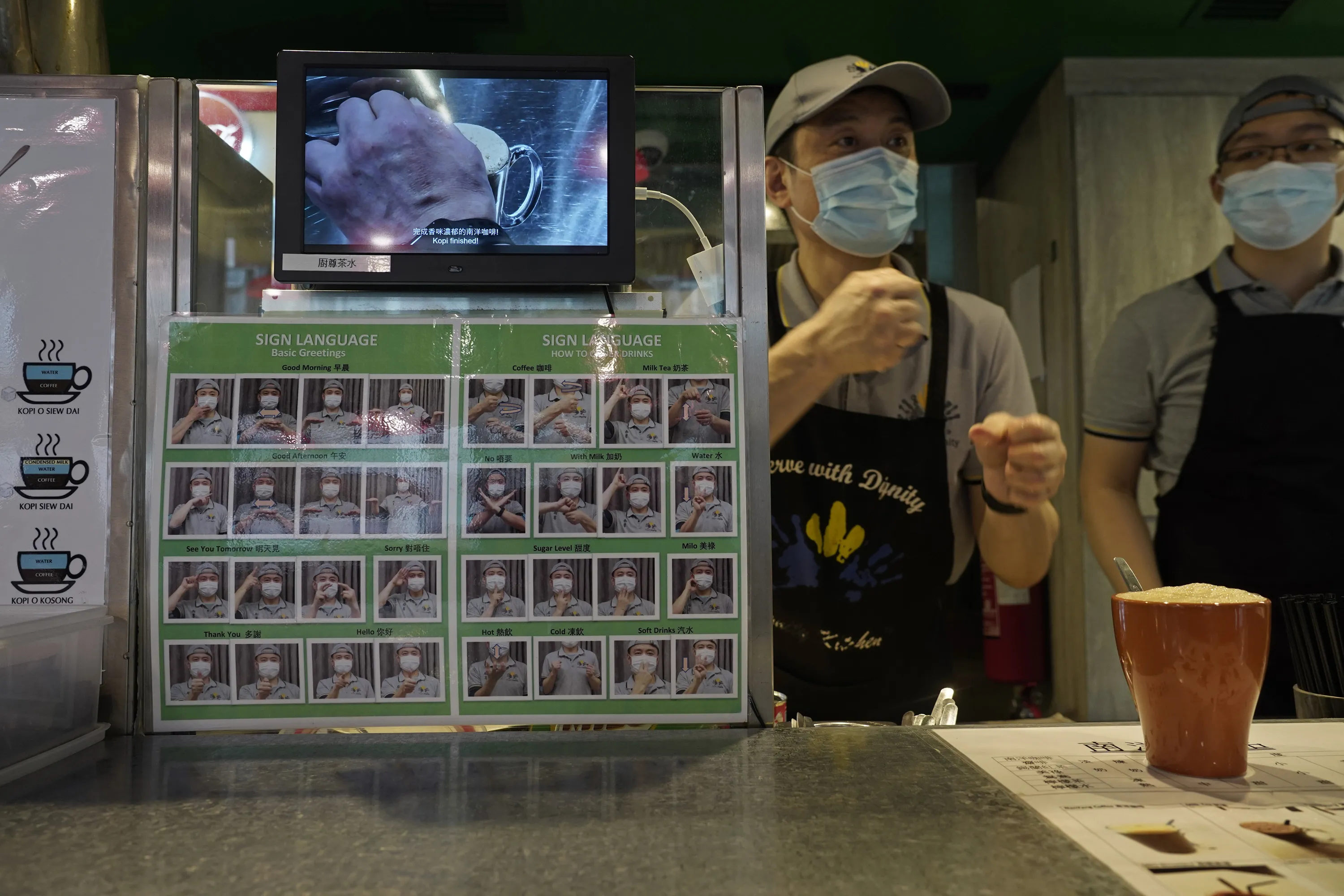 A staff member gestures behind the counter with a board showing informations by sign languages at Dignity Kitchen in Hong Kong on November 17, 2020. Located smack in the middle of Hong Kong's bustling Mong Kok neighborhood, Dignity Kitchen offers an array of mouthwatering Singaporean fare. But what sets Dignity Kitchen apart from other restaurants in the city is that it is a social enterprise, almost entirely staffed by employees with physical or mental disabilities. (Photo by Vincent Yu/AP Photo)