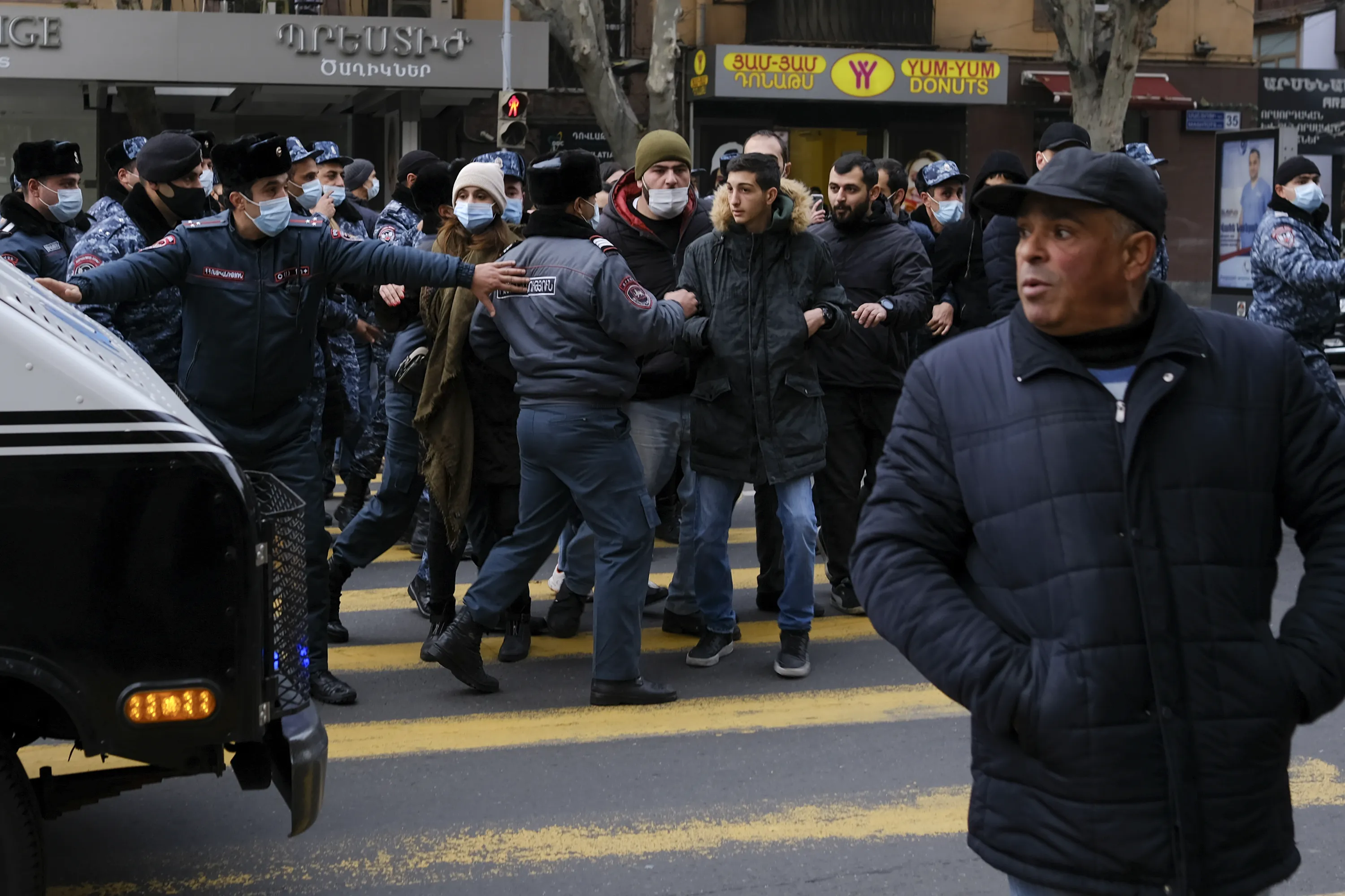 Police try to block demonstrators during a rally demanding the resignation of the country's prime minister over his handling of the conflict with Azerbaijan over Nagorno-Karabakh in Yerevan, Armenia, Tuesday, December 8, 2020.Armenian opposition politicians and their supporters have been calling for Prime Minister Nikol Pashinyan to step down ever since he signed a peace deal that halted 44 days of deadly fighting over the separatist region, but called for territorial concessions to Azerbaijan. (Photo by Aram Kirakosyan/PAN Photo via AP Photo)