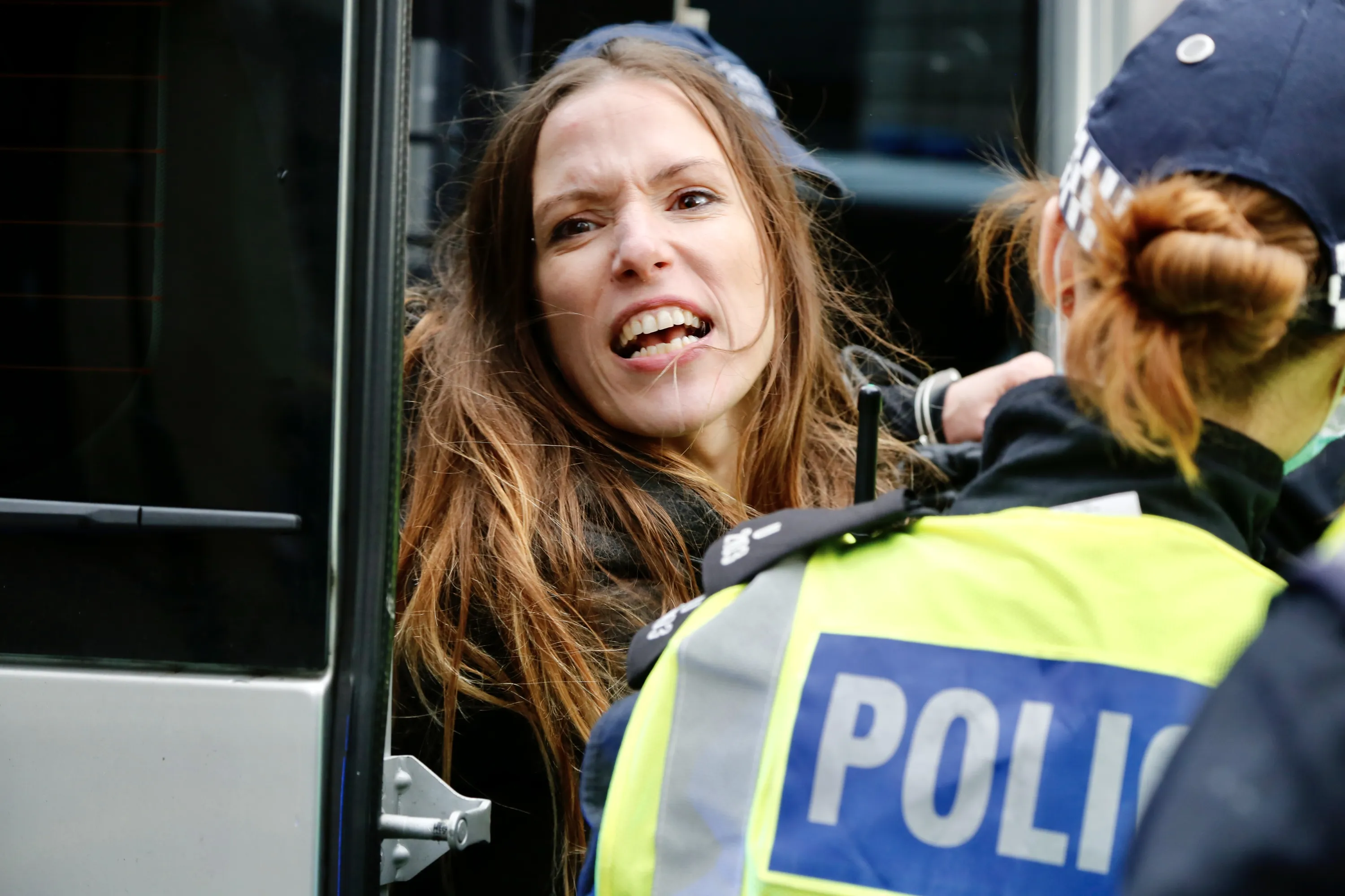 Police officers take into custody some protesters as members of StandUpX stage a protest against coronavirus (Covid-19) measures and vaccine in London, United Kingdom on October 24, 2020. (Photo by Hasan Esen/Anadolu Agency via Getty Images)