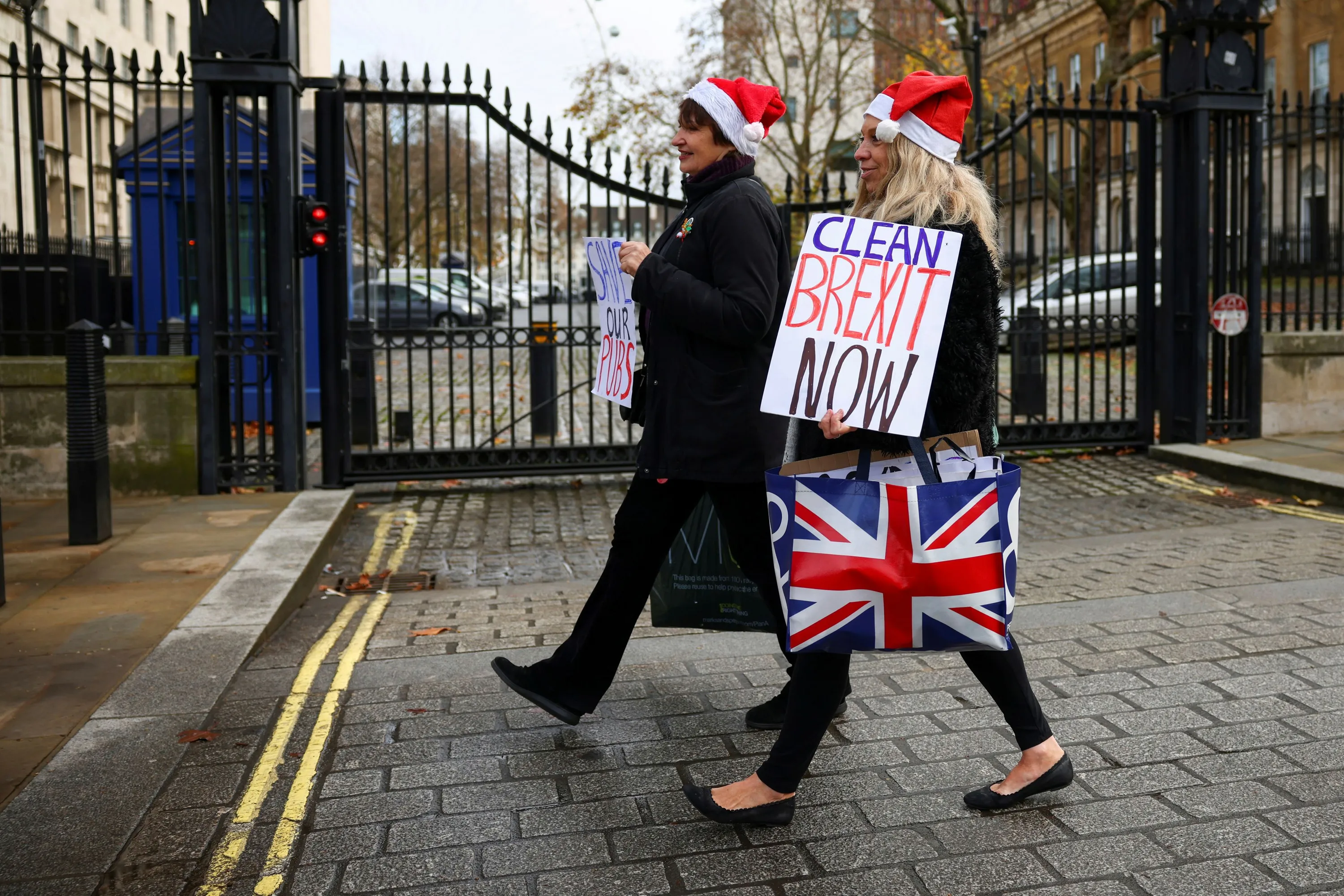 Pro-Brexit supporters carries placards as they walk in Westminster, London, Britain on December 9, 2020. (Photo by Henry Nicholls/Reuters)